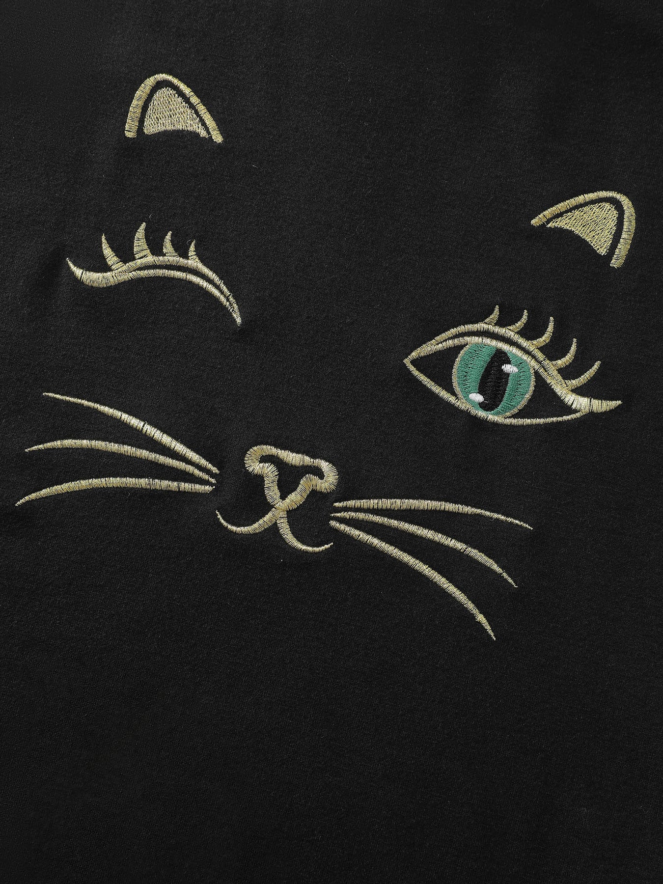 Meow Embroidery Stretchy Round Neck Sweatshirt