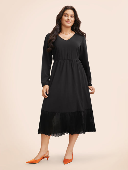 Mesh Patchwork Lantern Sleeve Pleated Dress