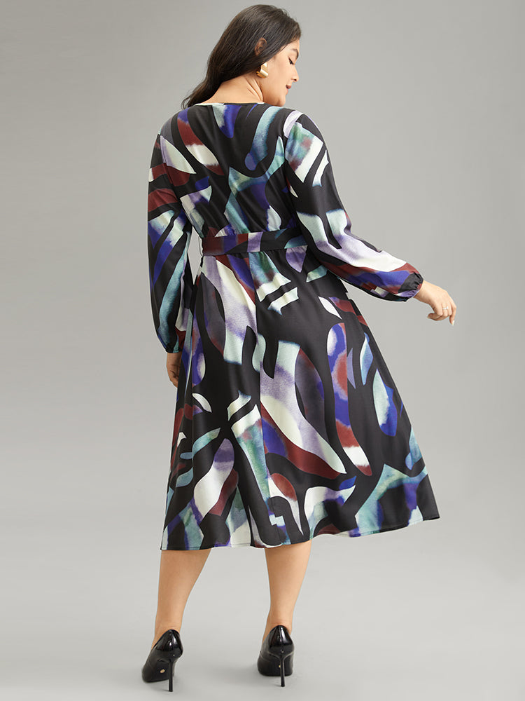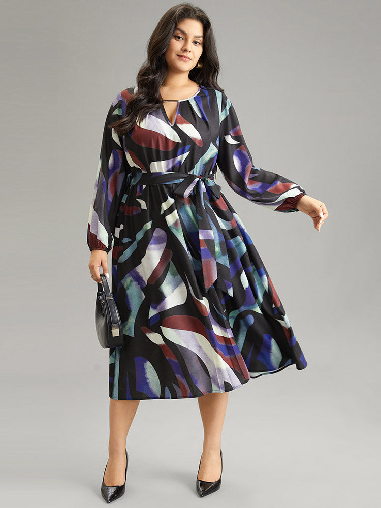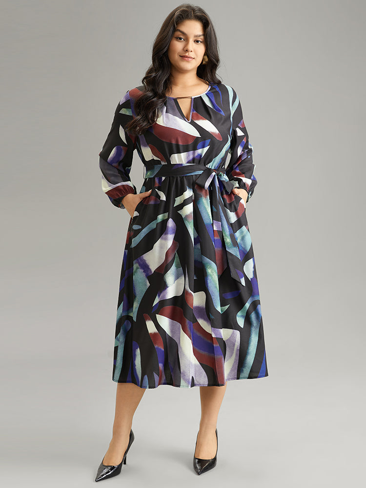 Metal Strip Notched Belted Colorblock Contrast Dress