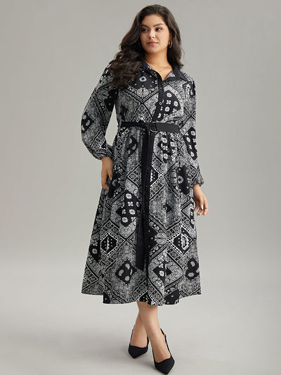 Moroccan Print Shirt Collar Belted Button Through Dress