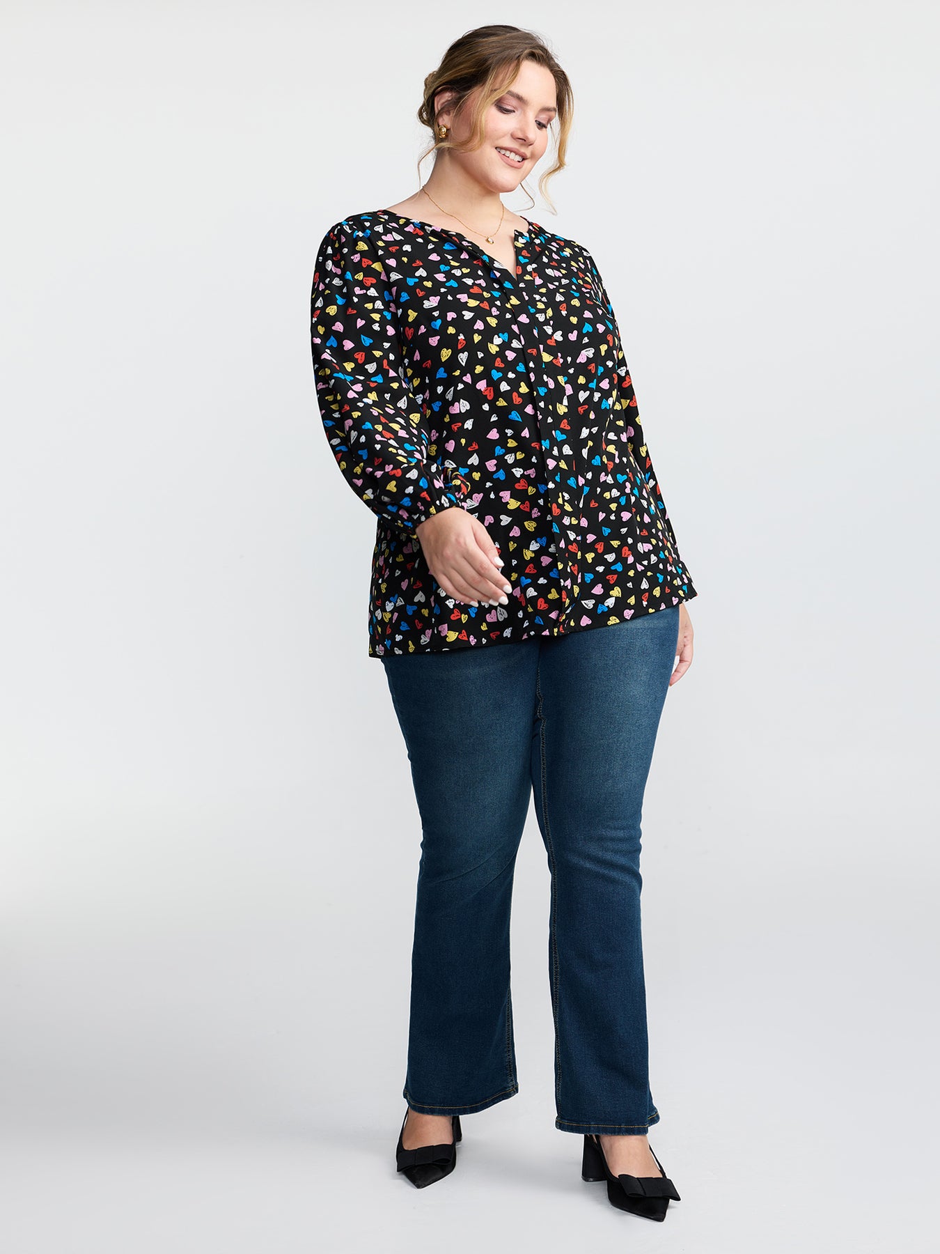 Multicolor Hearts Print Notched Collar Blouse