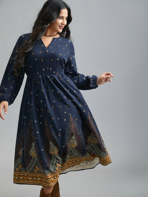Notched Collar Boho Print Contrast Dress