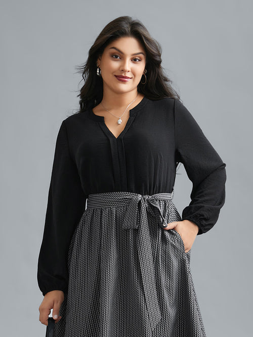 Notched Collar Color Block Waist Tie Dress