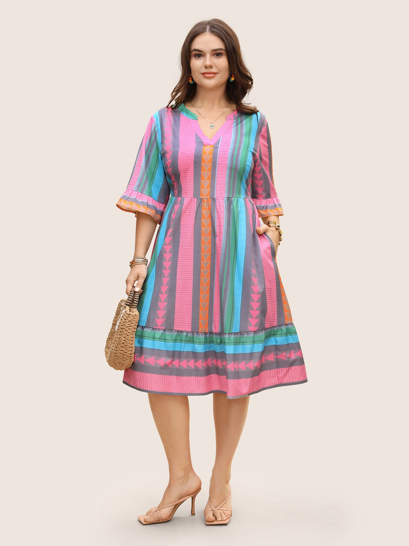 Notched Collar Geometric Striped Ruffle Sleeve Dress