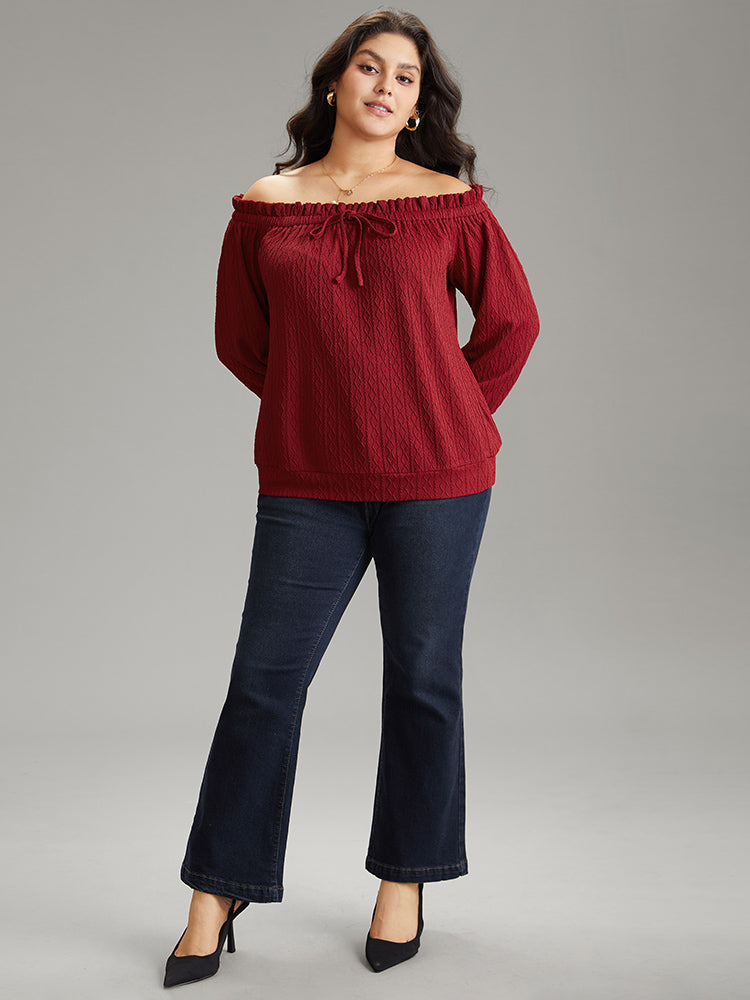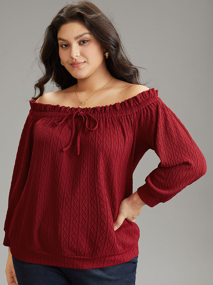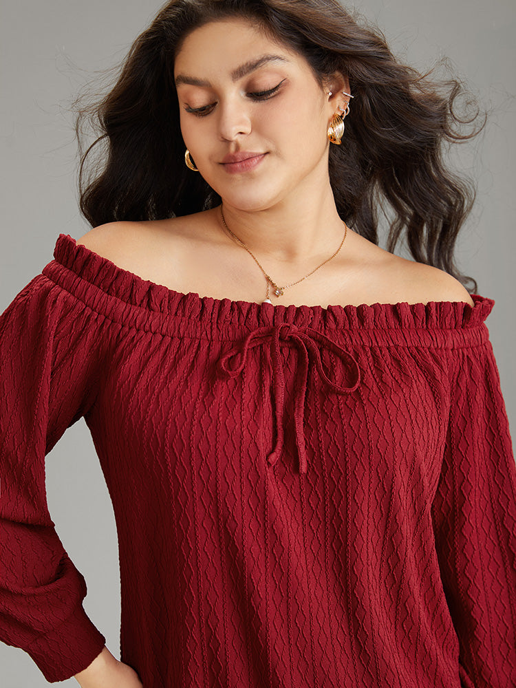 Off Shoulder Ties Frill Trim Jacquard T-shirt