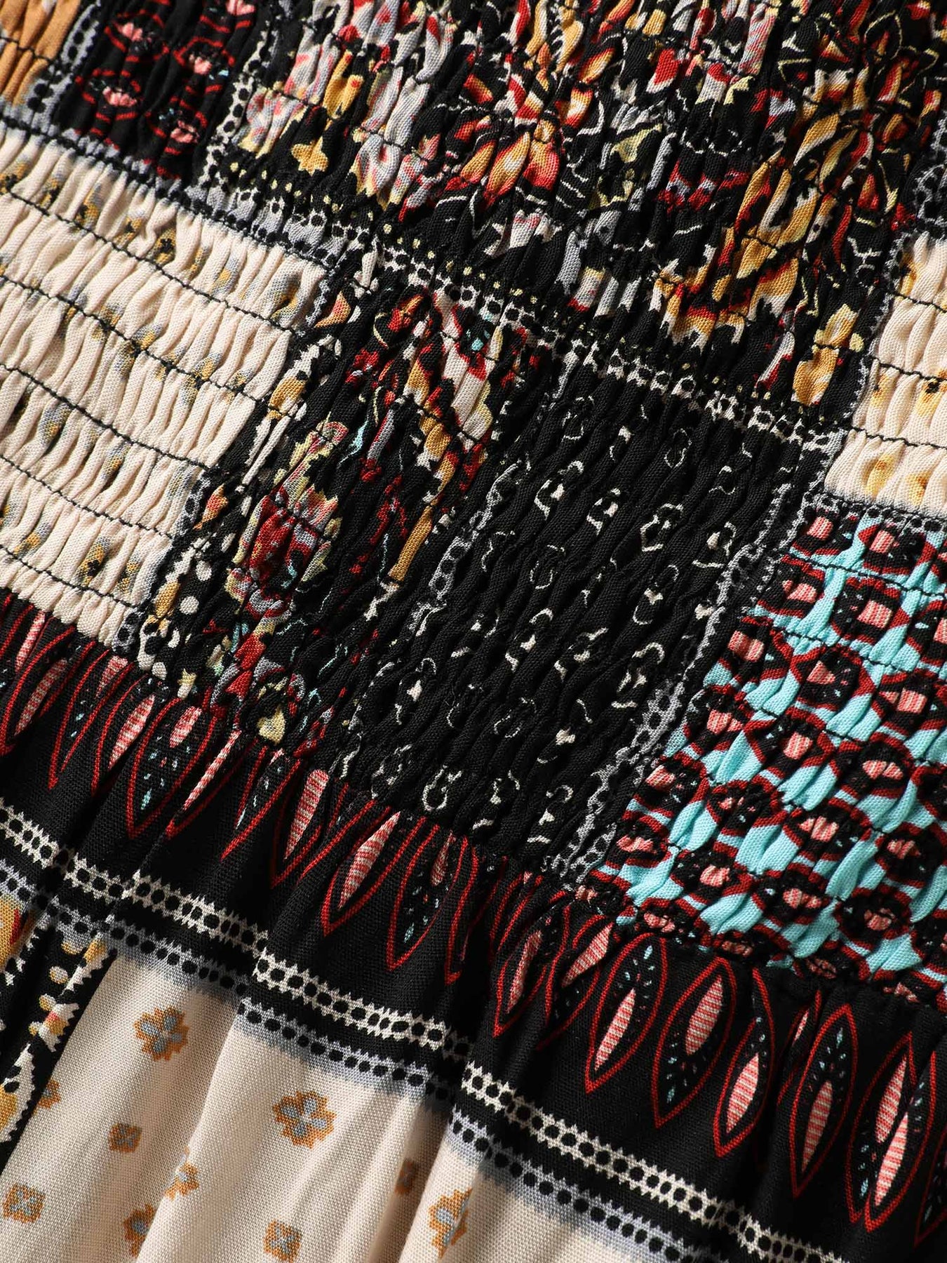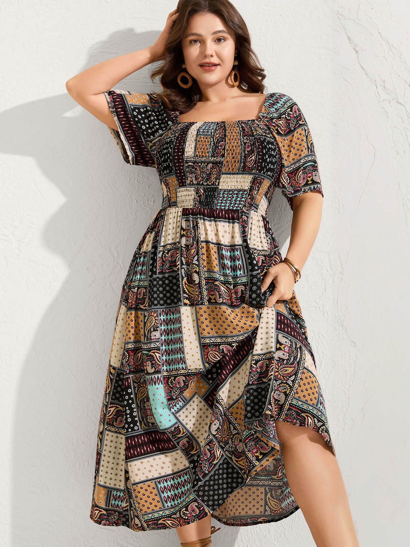 Paisley Floral Collage Shirred Pockets Midi Dress