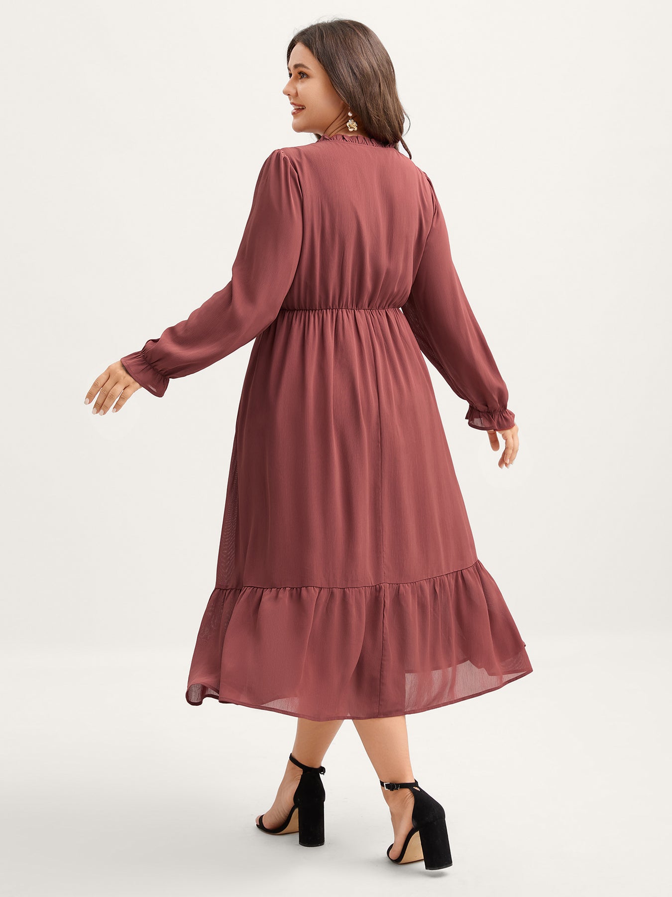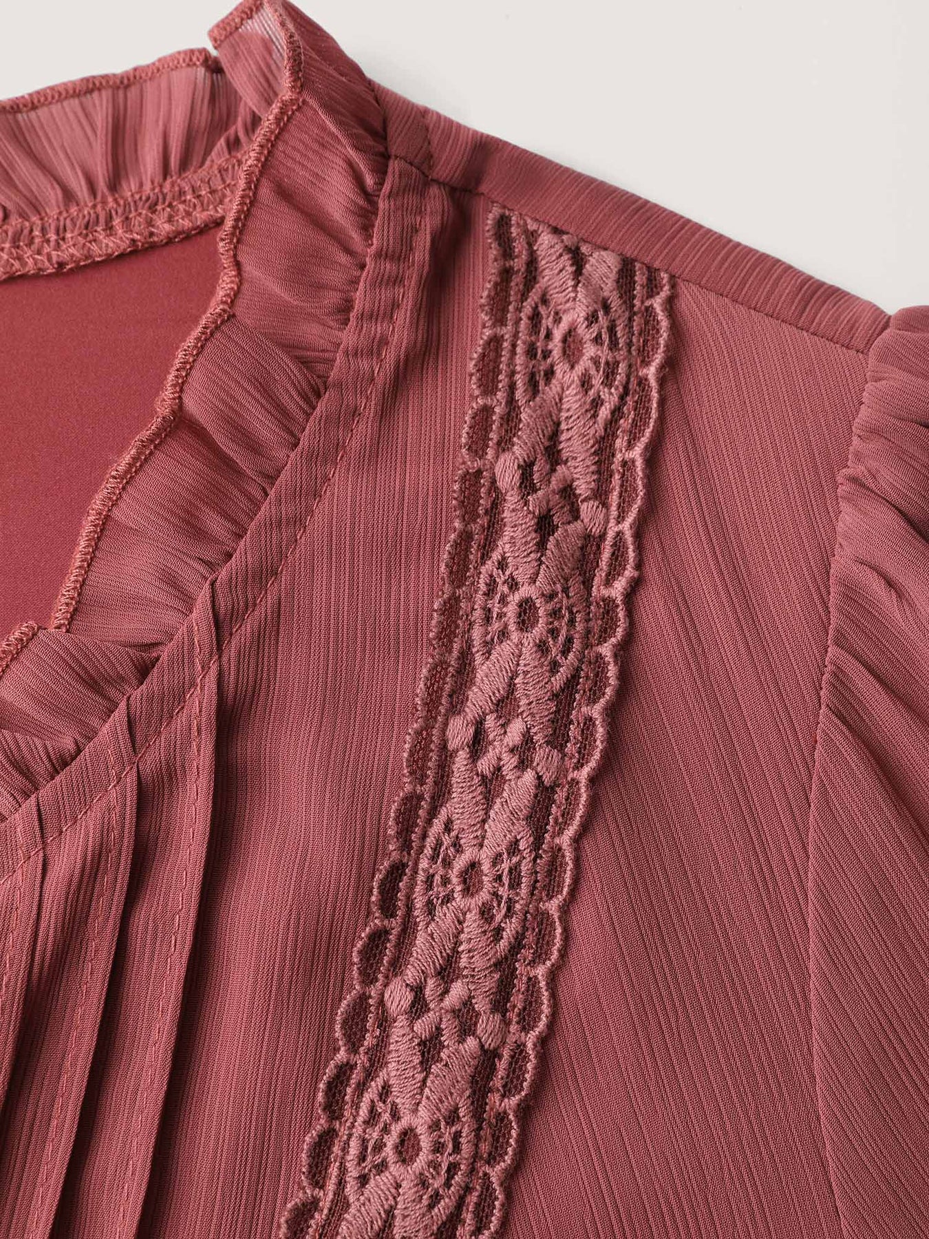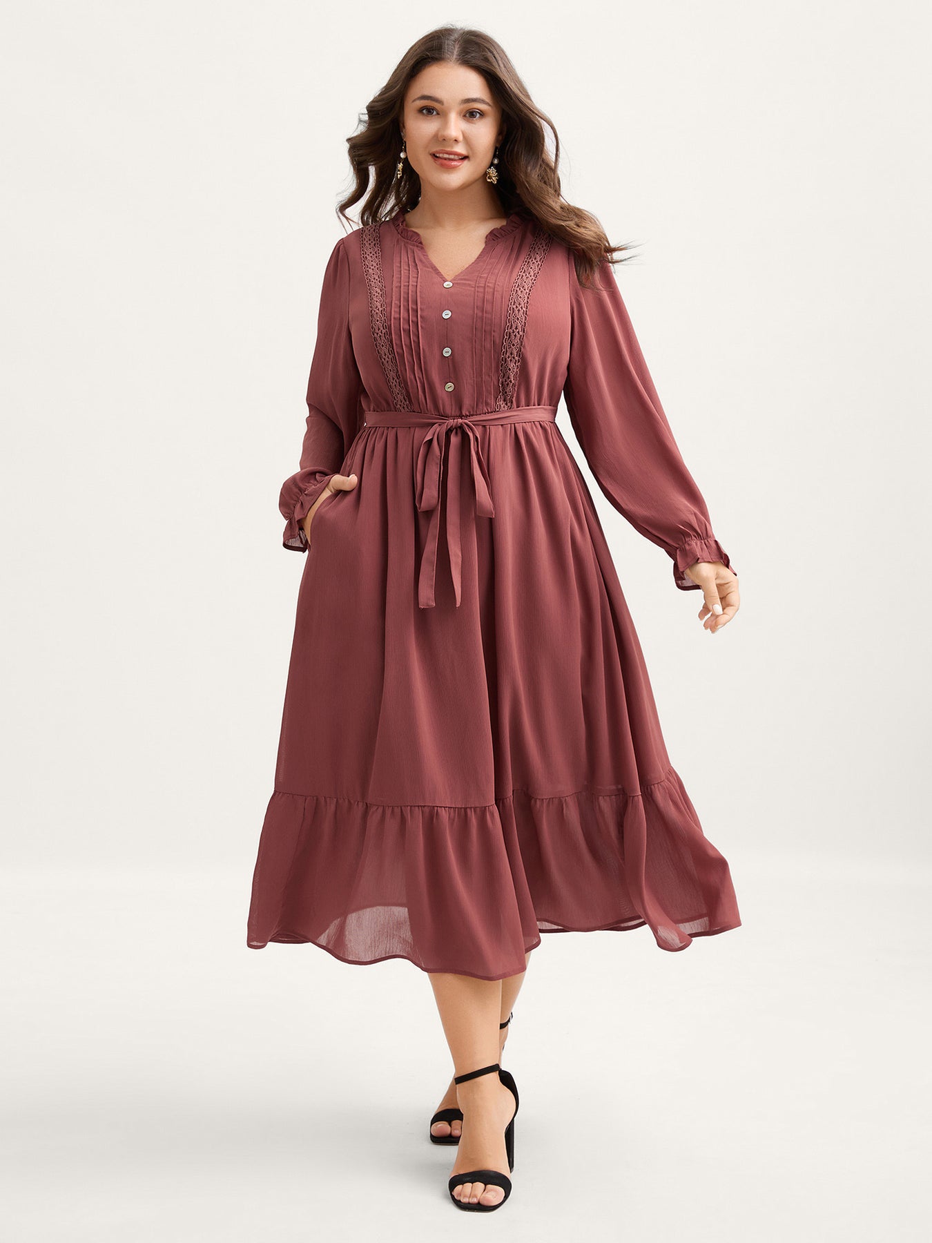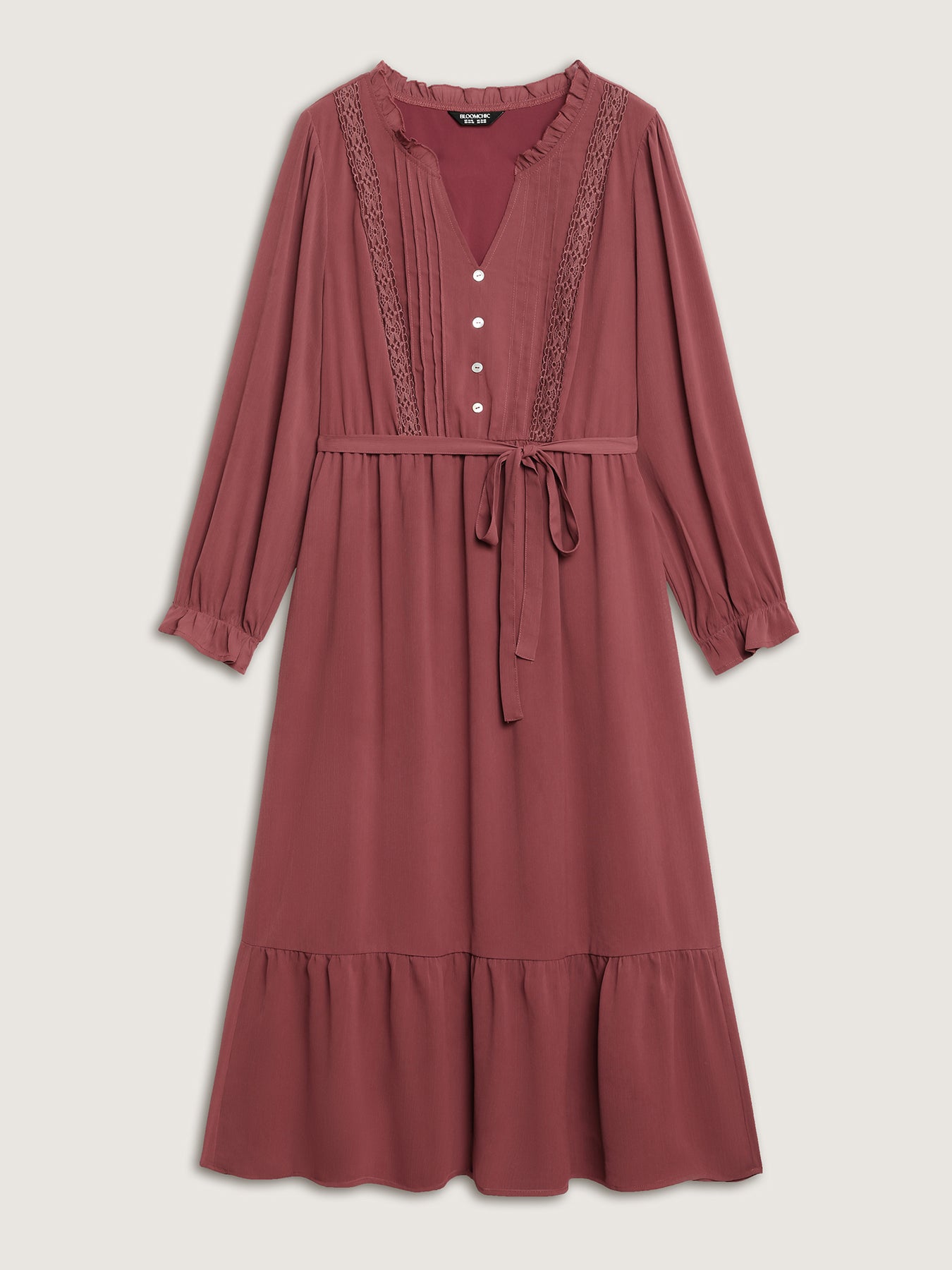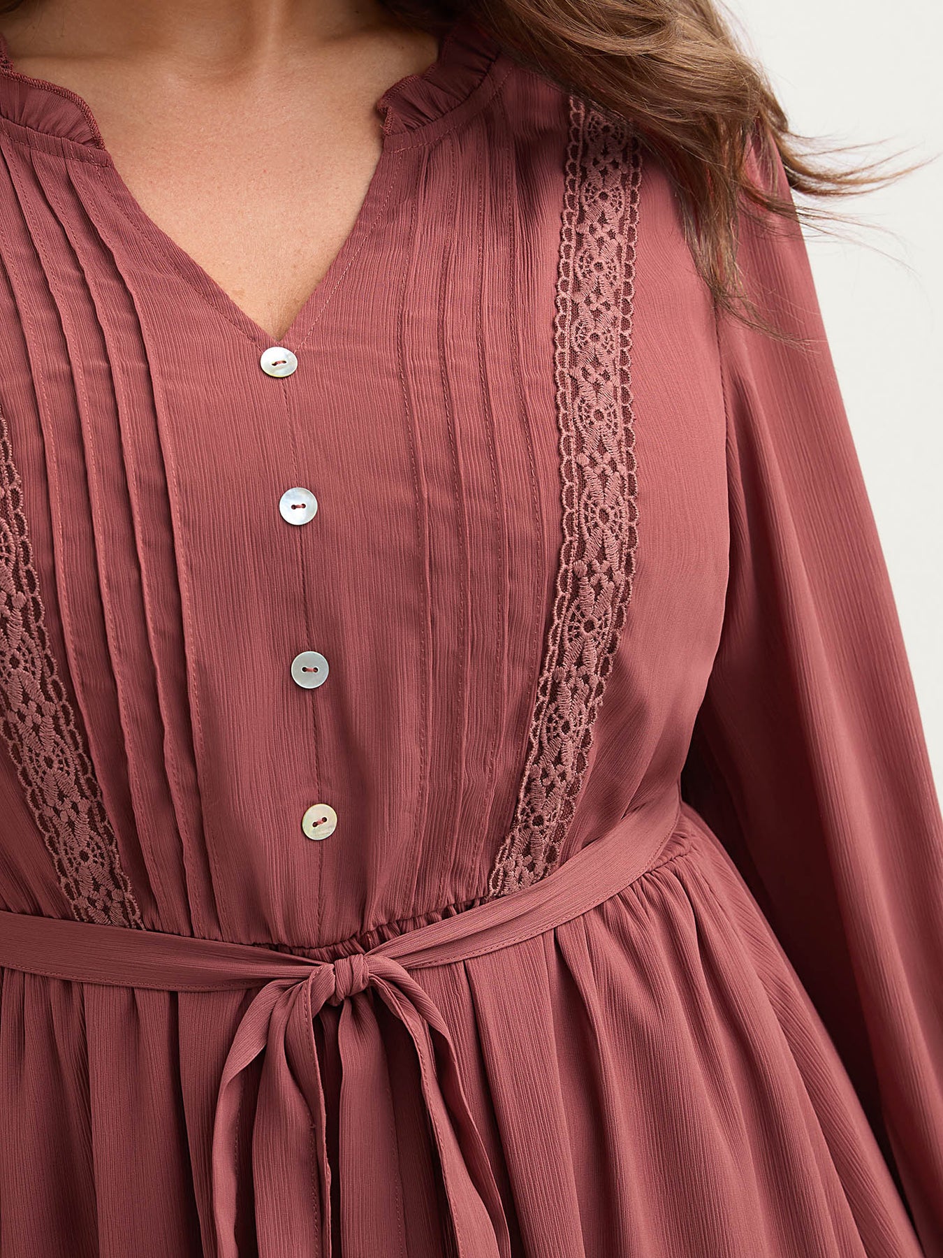 Pintuck Pleats Lace Trim Waist-Tie Maxi Dress