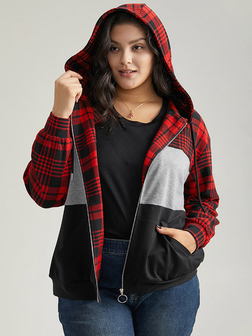 Plaid Contrast Patchwork Drawstring Zipper Jacket