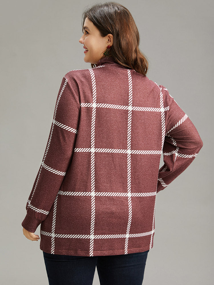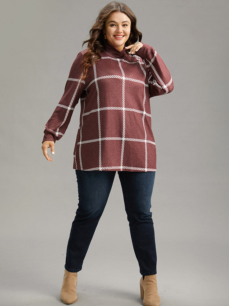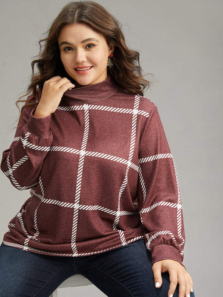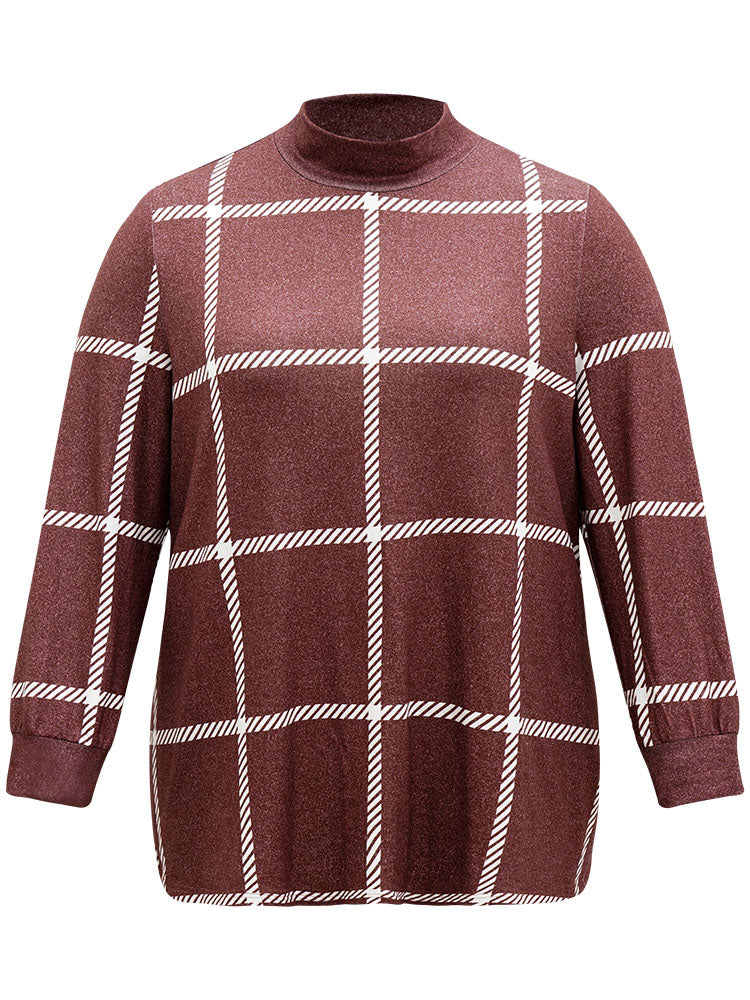 Plaid Geometric Contrast Funnel Neck T-shirt