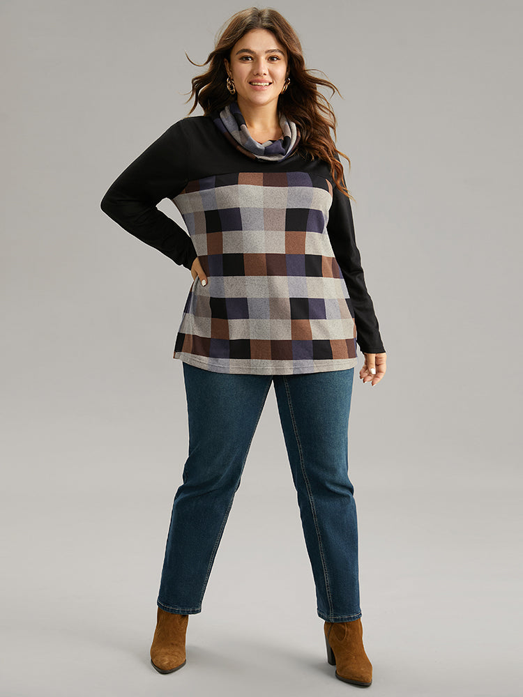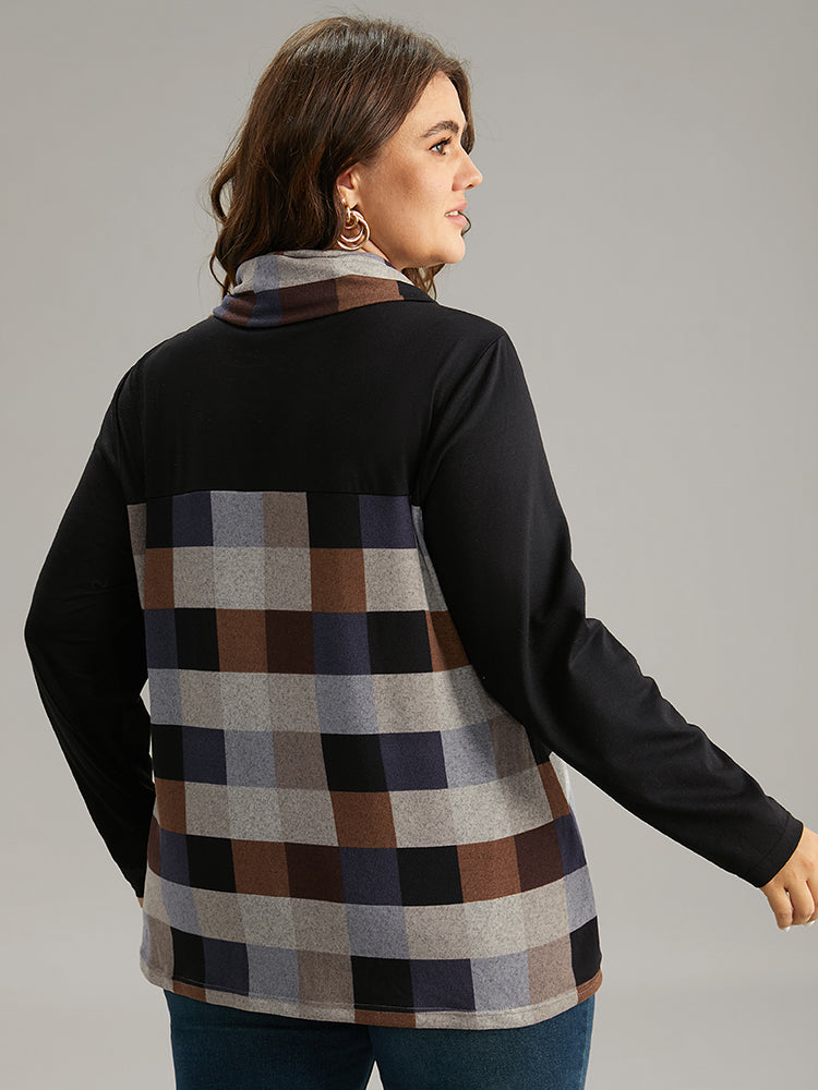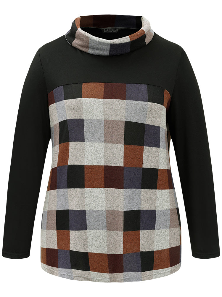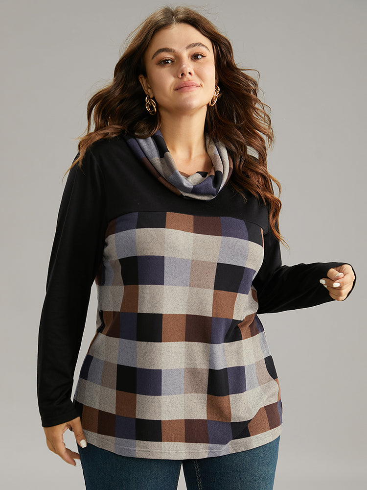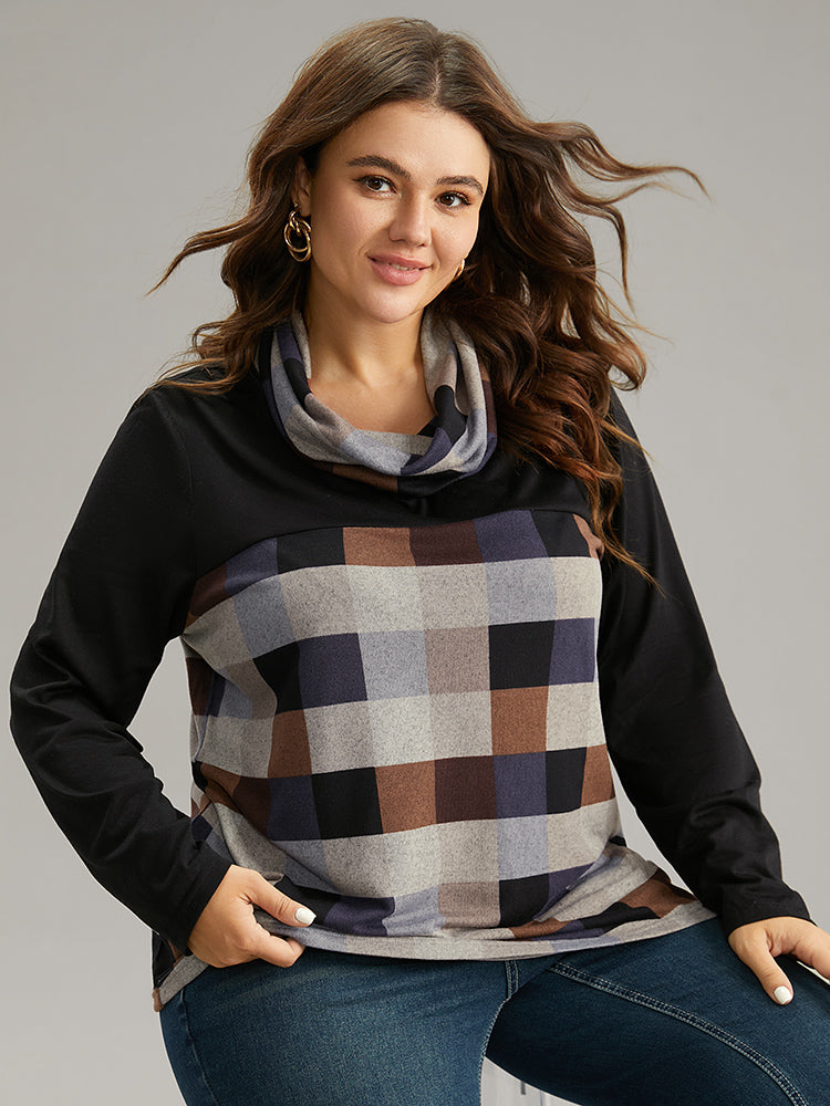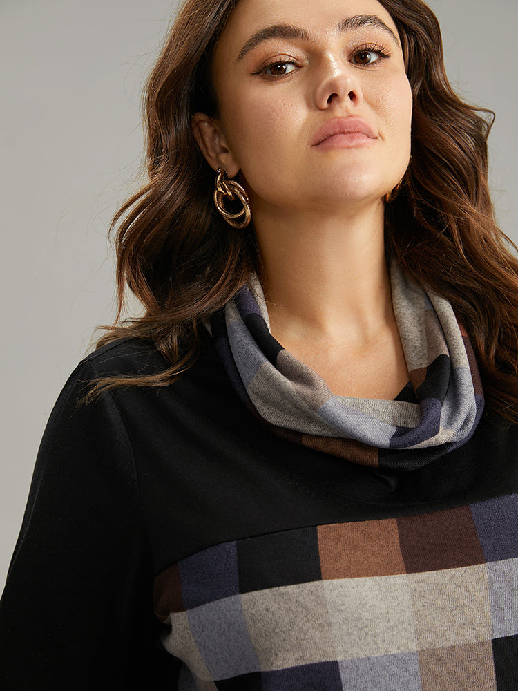 Plaid Patchwork Contrast Cowl Neck T-shirt