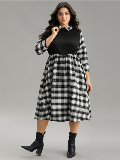 Plaid Patchwork Elastic Waist Lapel Collar Dress