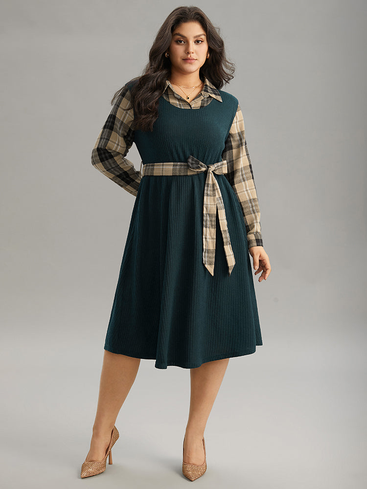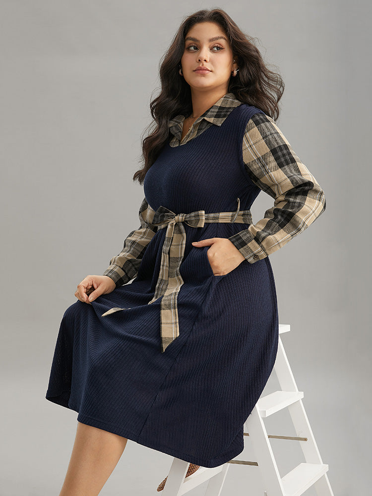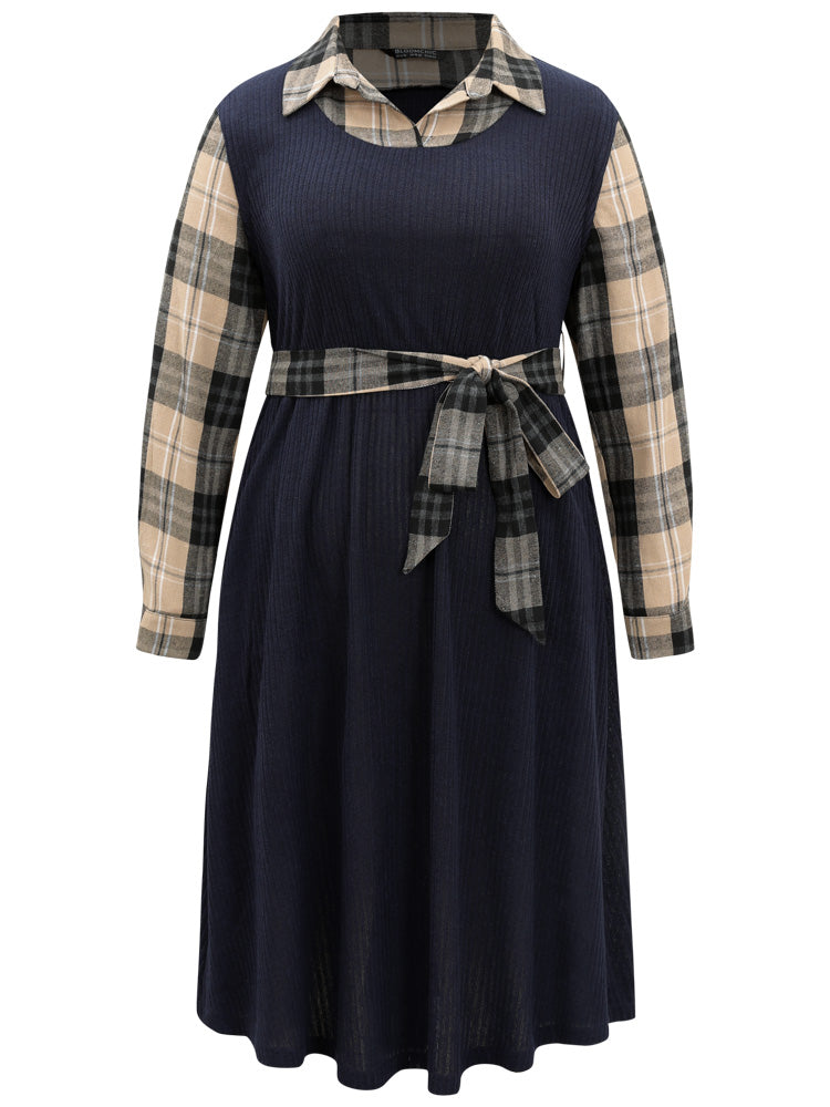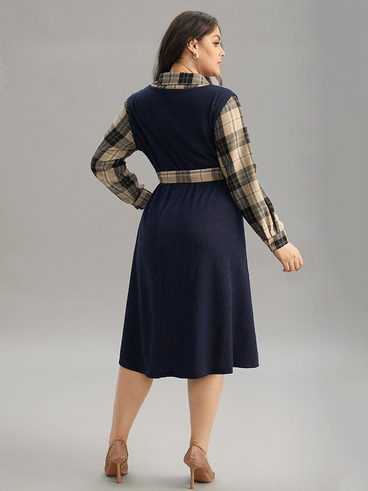 Plaid Patchwork Rib Knit Shirt Collar Belted Dress
