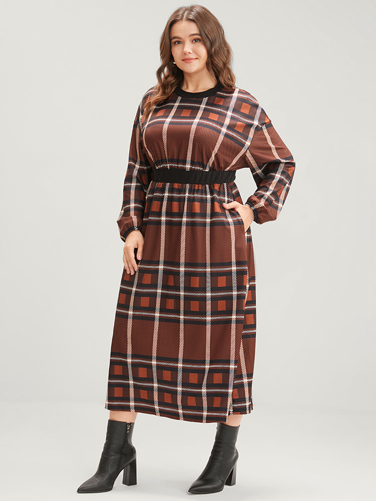 Plaid Patchwork Round Neck Lantern Sleeve Pocket Midi Dress