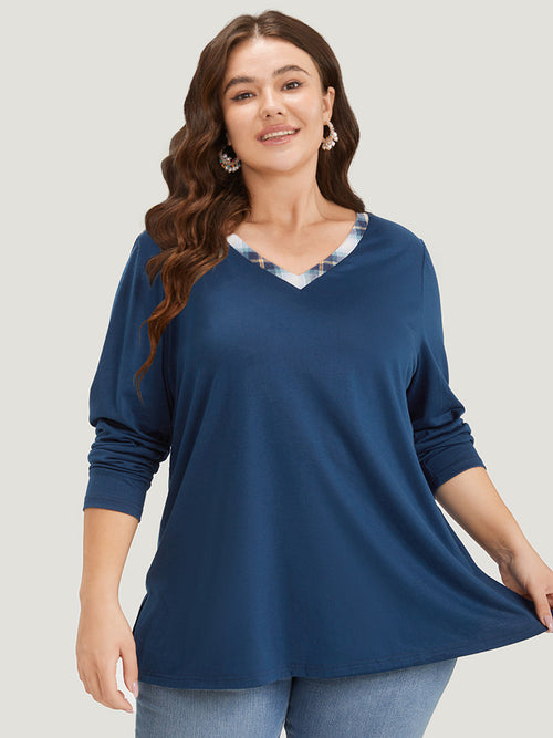 Plaid Patchwork V Neck Split Side T-shirt