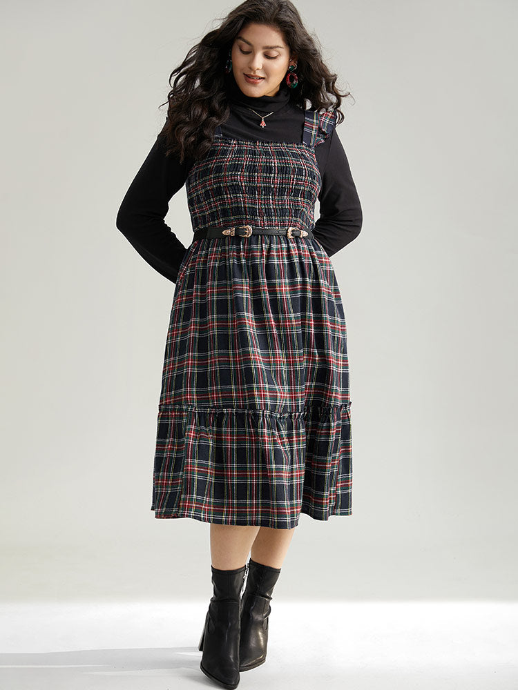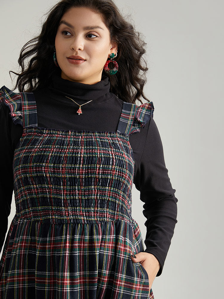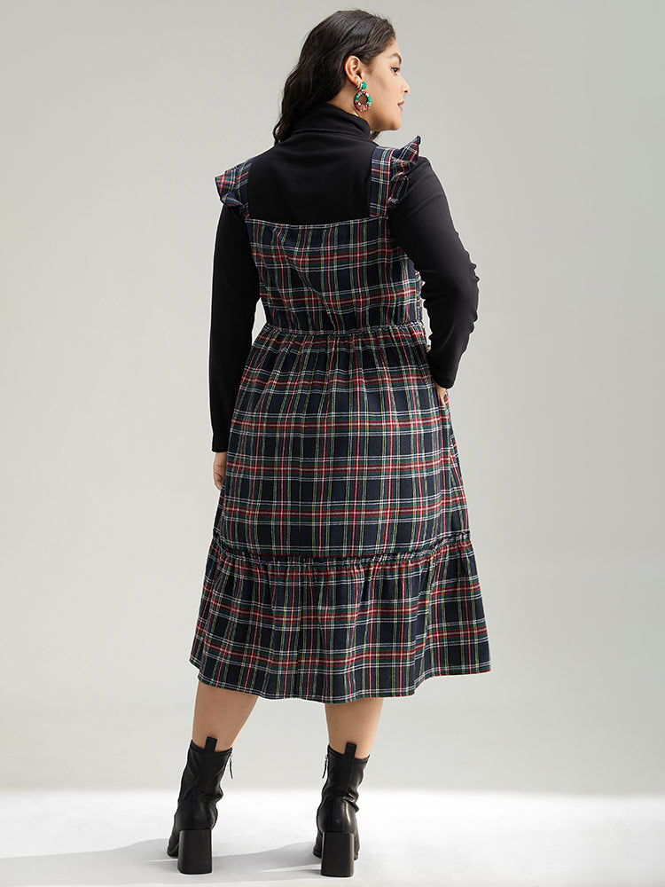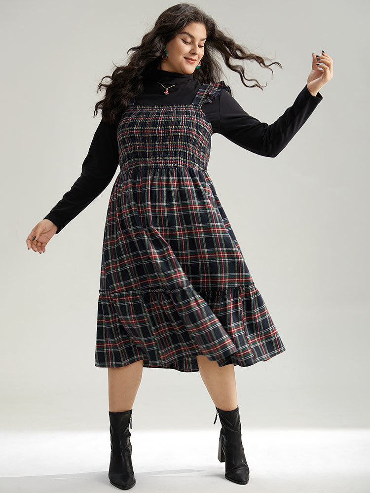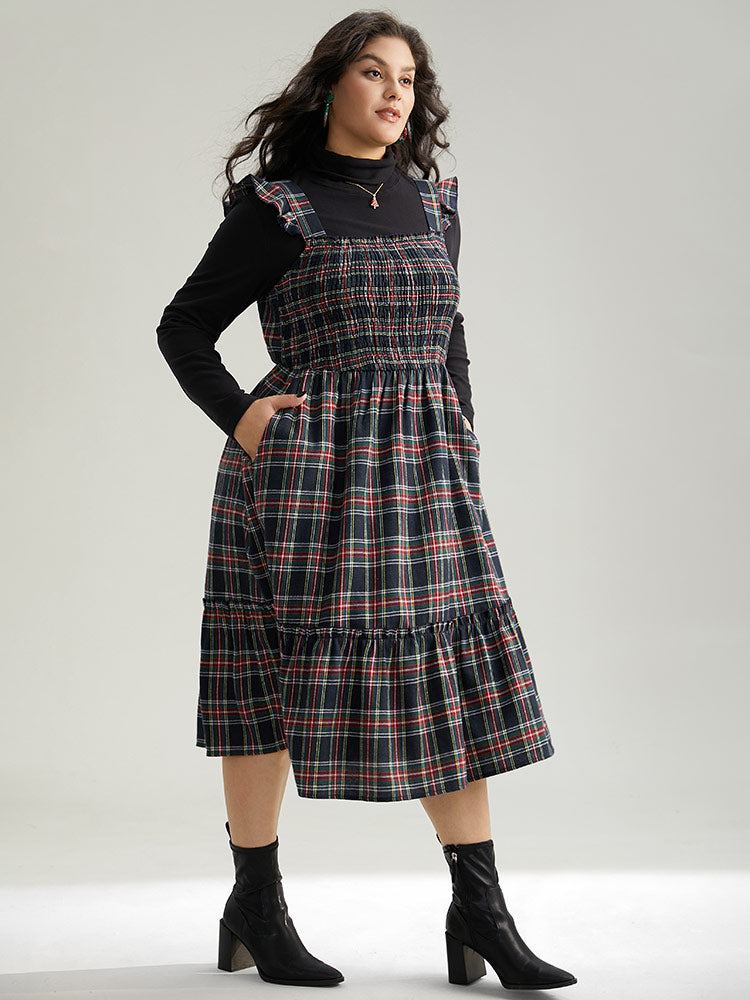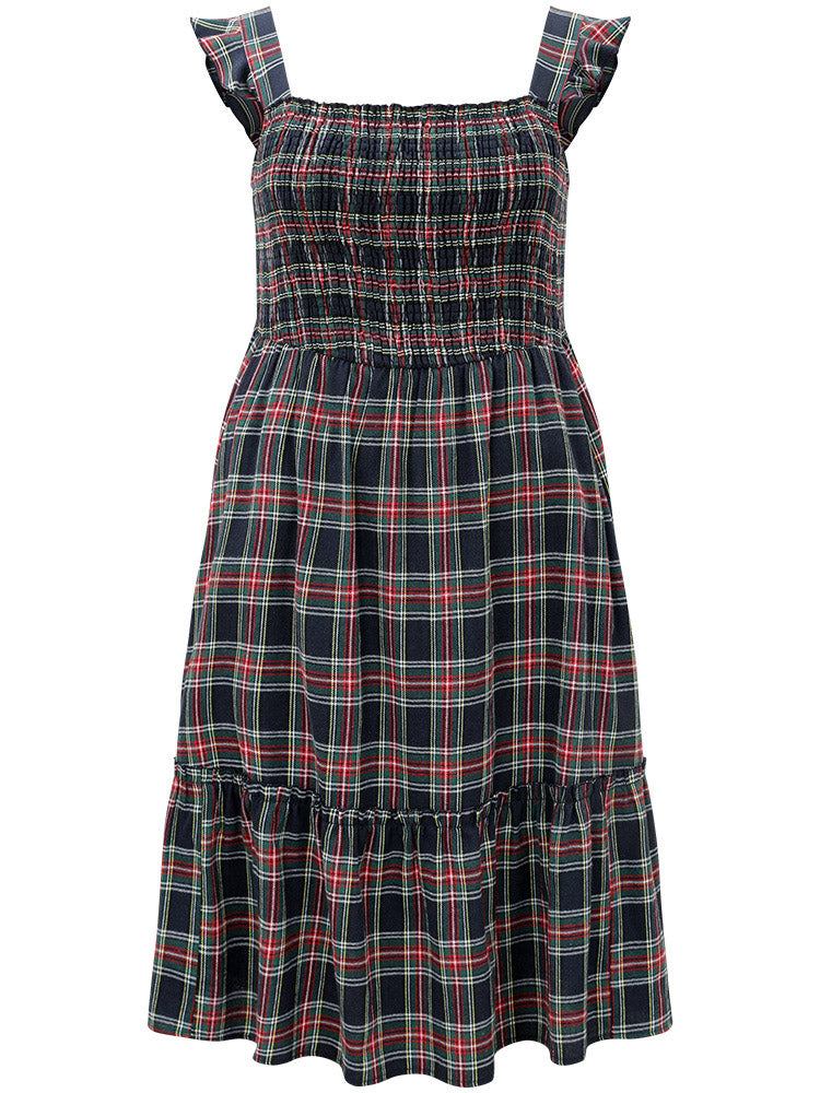 Plaid Ruffle Trim Shirred Spaghetti Strap Dress