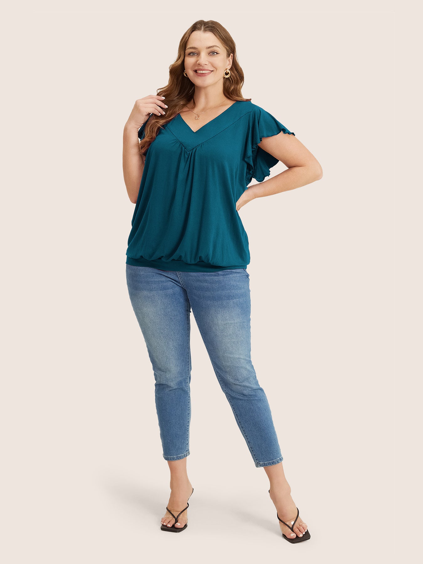 Plain Gathered V Neck Ruffle Sleeve T-shirt