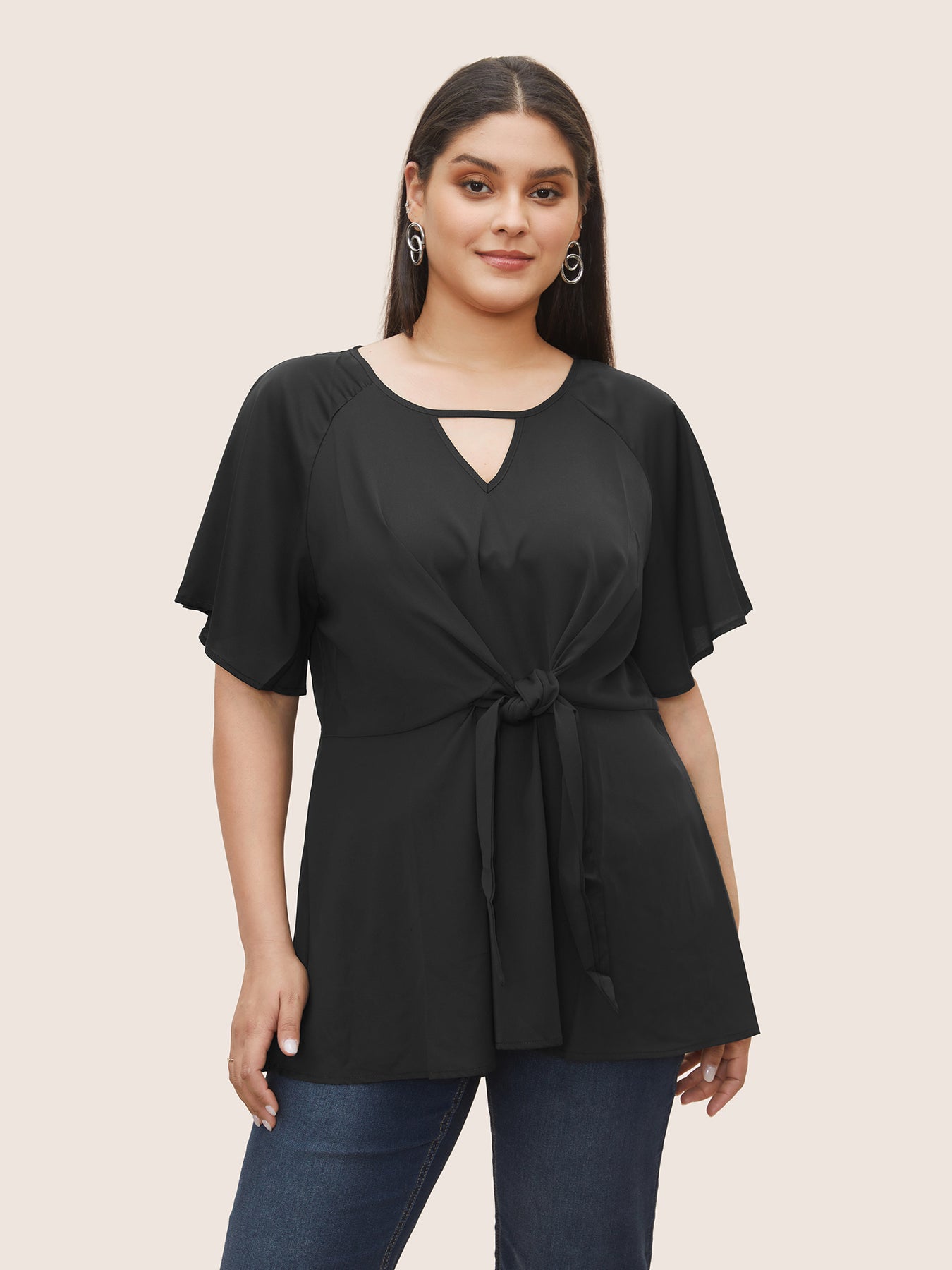 Plain Keyhole Knotted Front Ruffle Sleeve Blouse