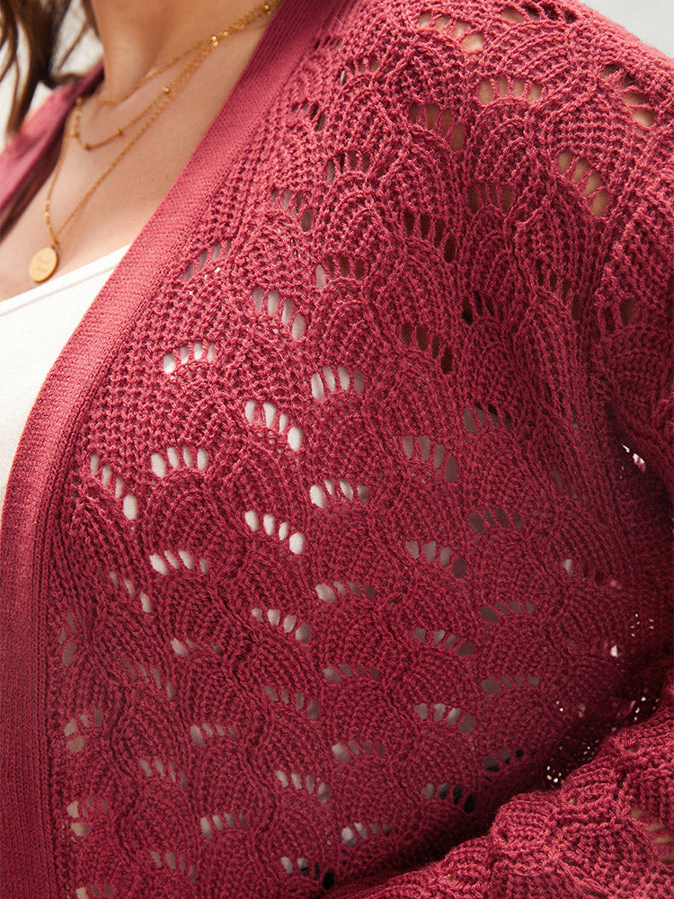Plain Pointelle Knit Cut Out Pocket Open Front Mid Long Cardigan
