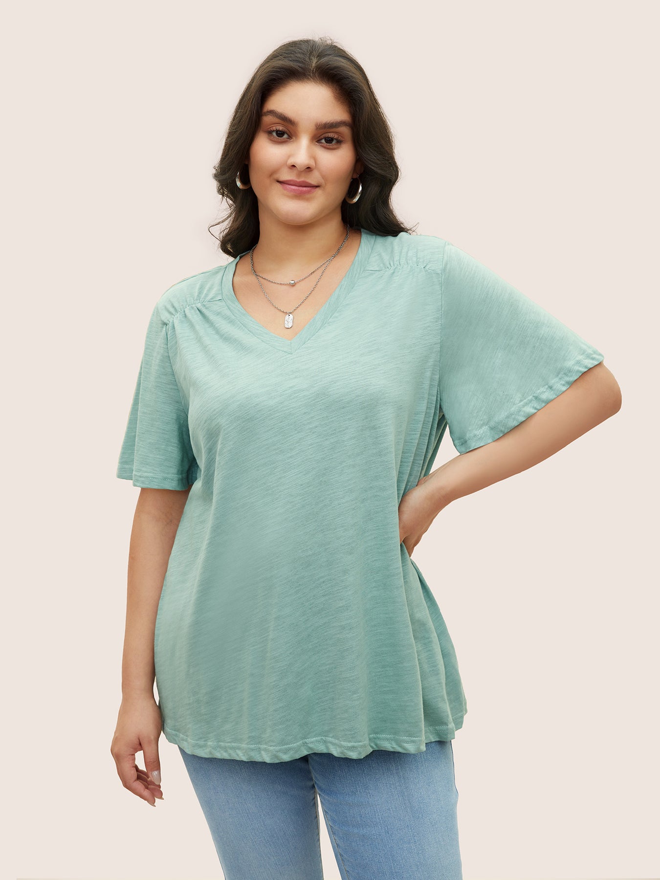 Plain Ruffle Sleeve Heather V Neck T-shirt