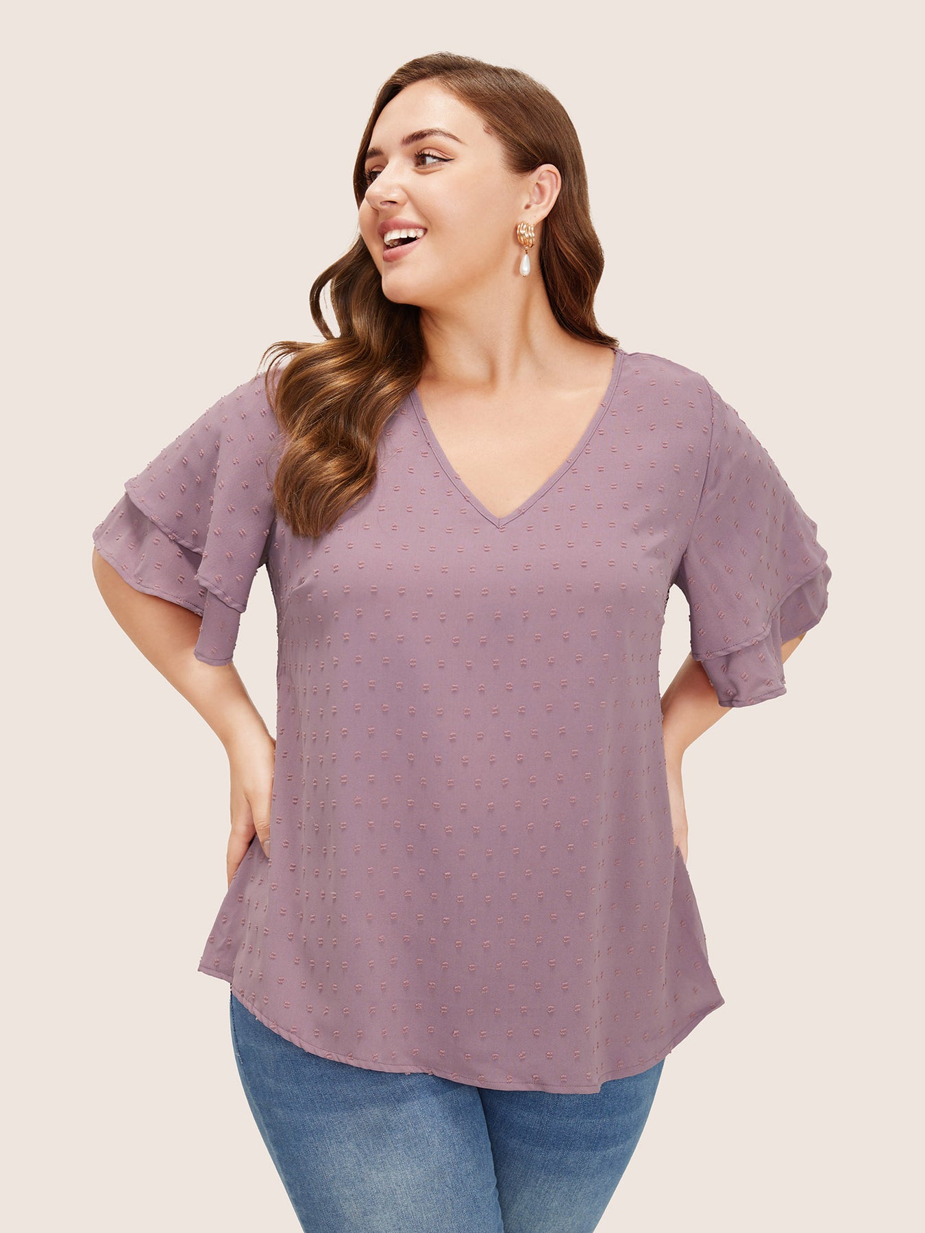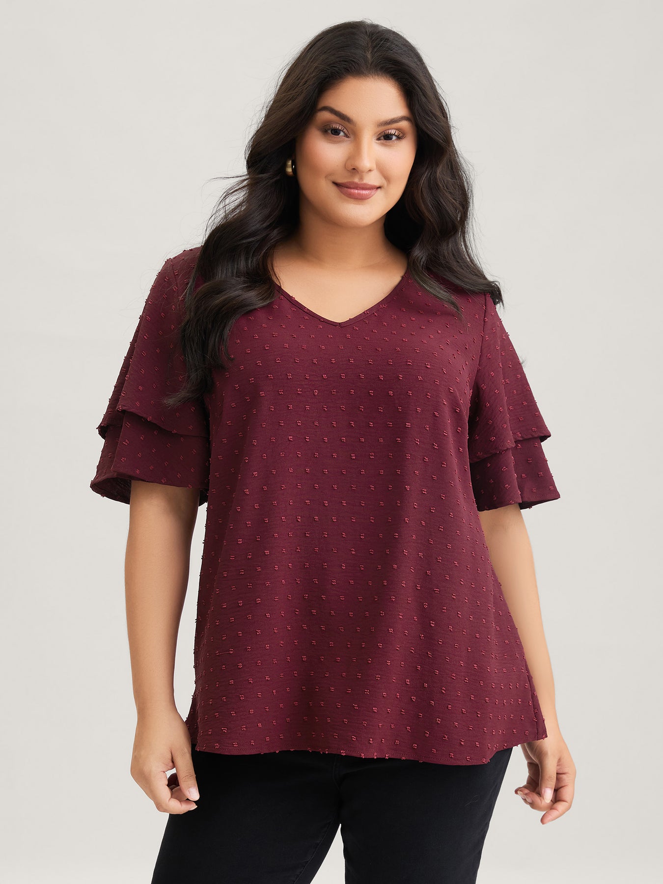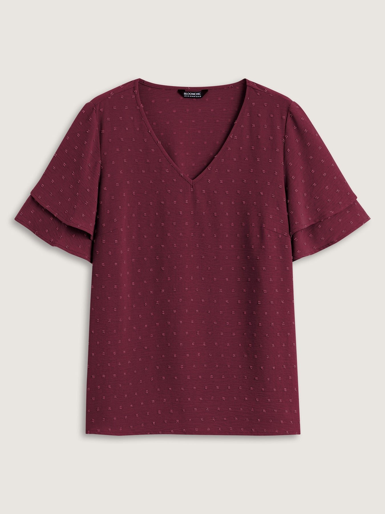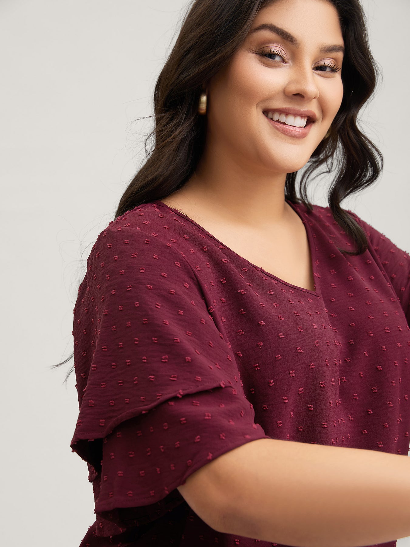 Plain Ruffle Tiered Sleeve V Neck Polka Dot Blouse