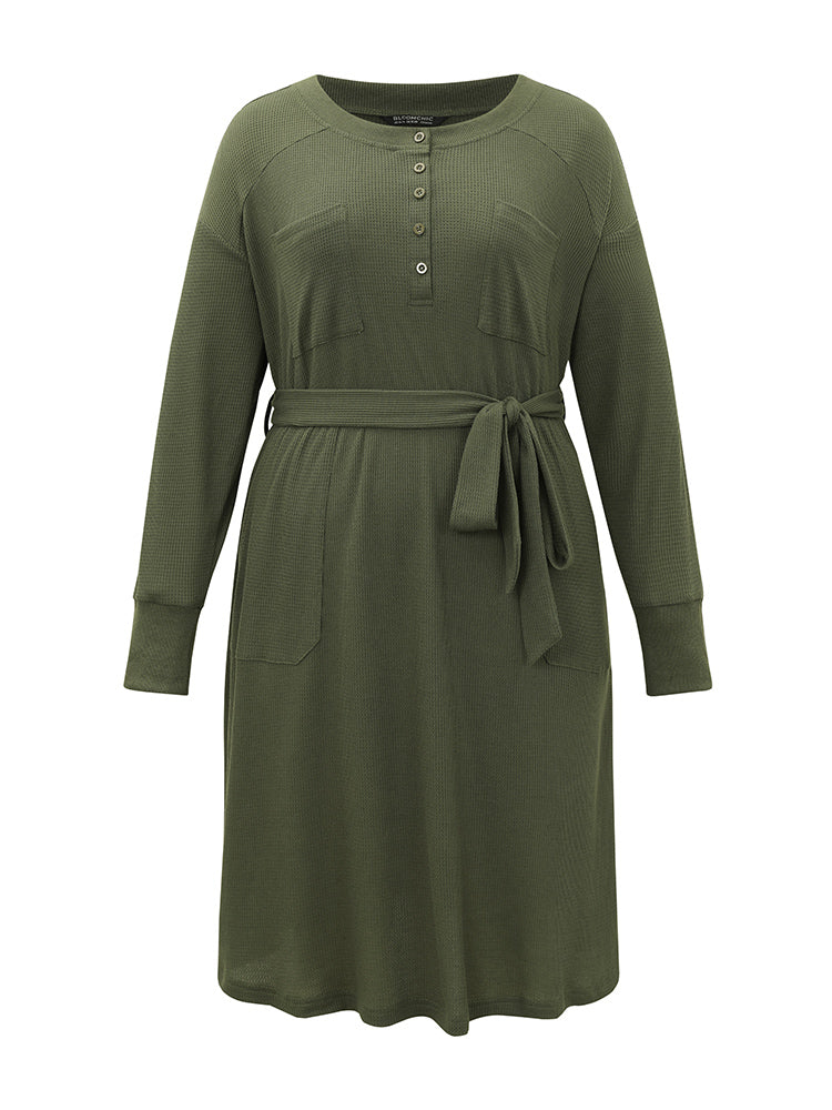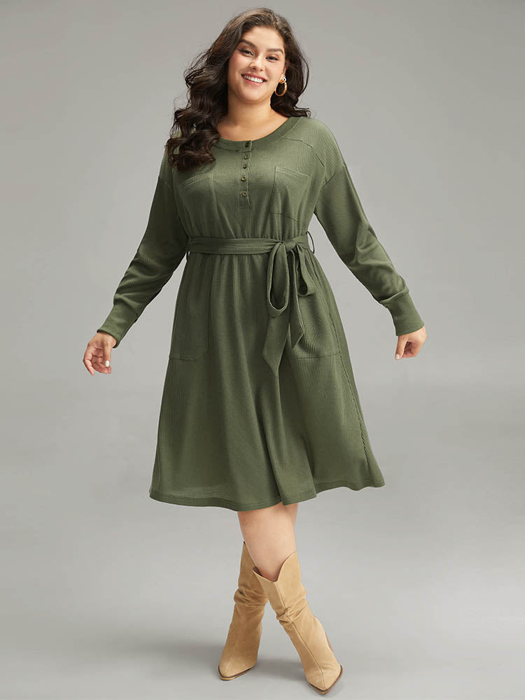 Plain Textured Belted Button Up Dress