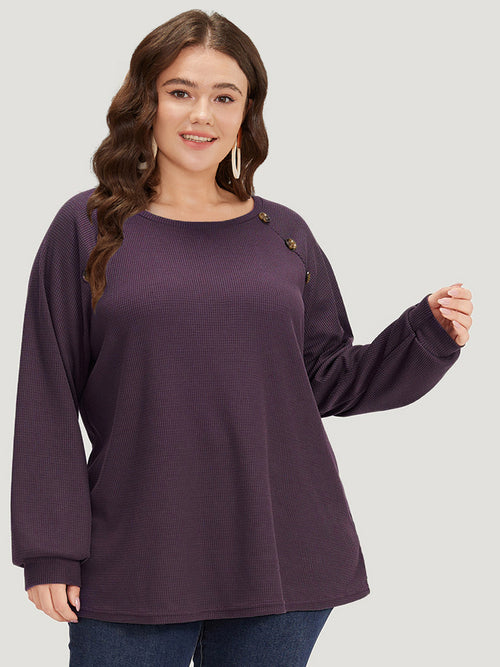 Plain Waffle Knit Button Detail Crew Neck Raglan Sleeve T-shirt