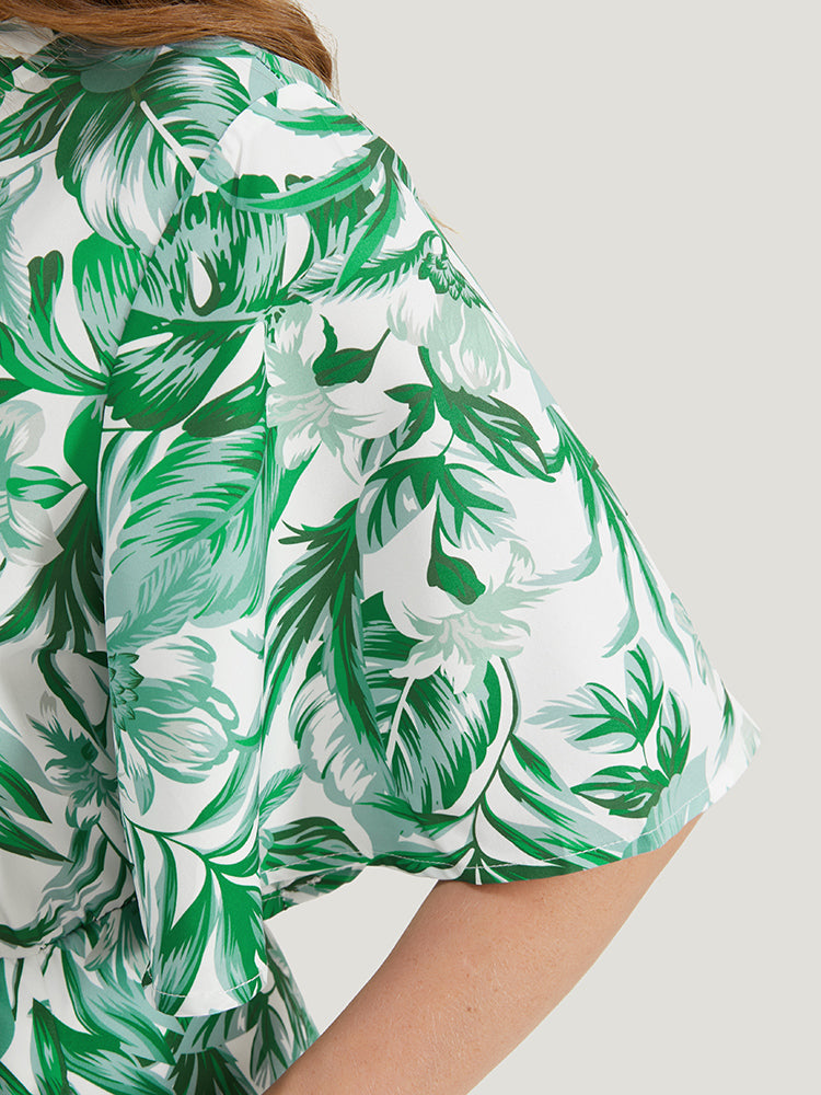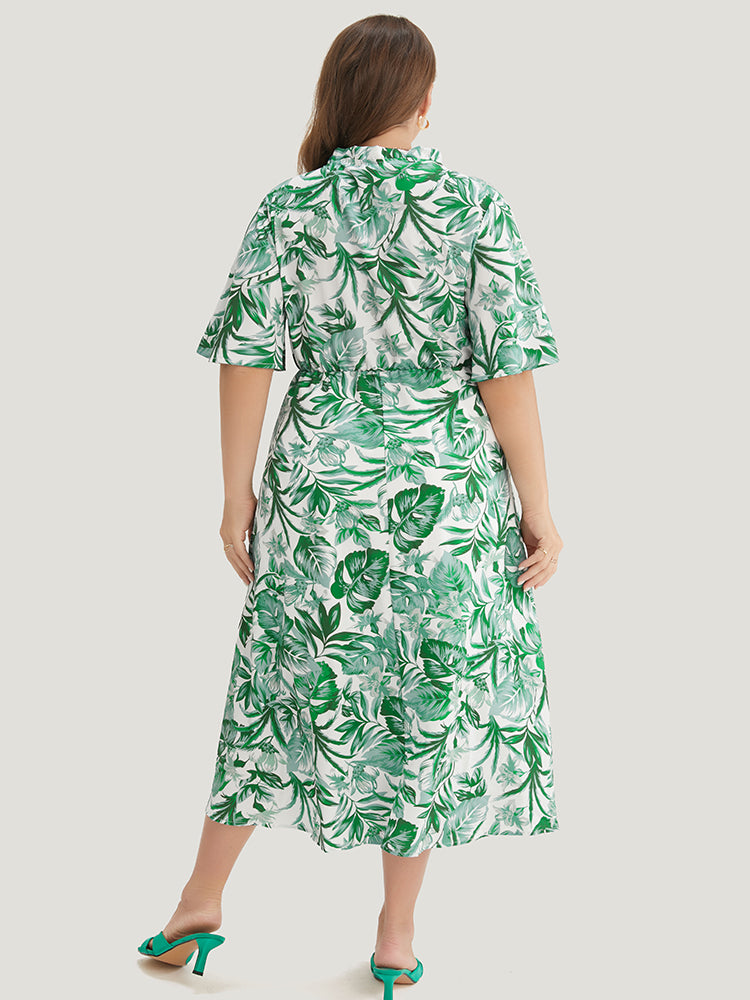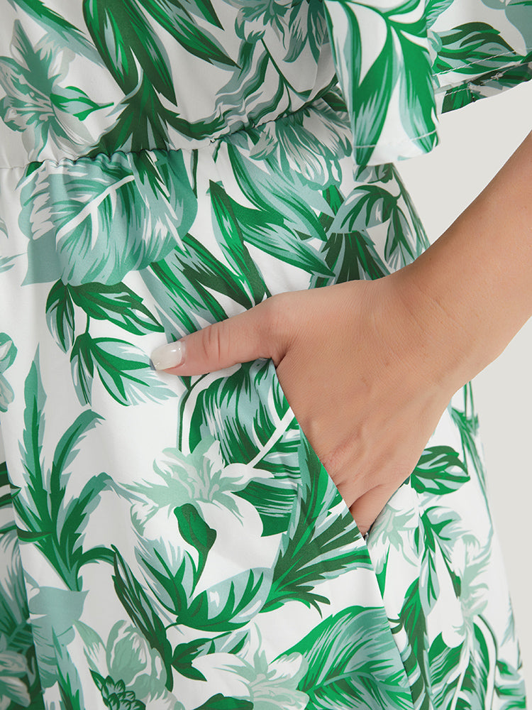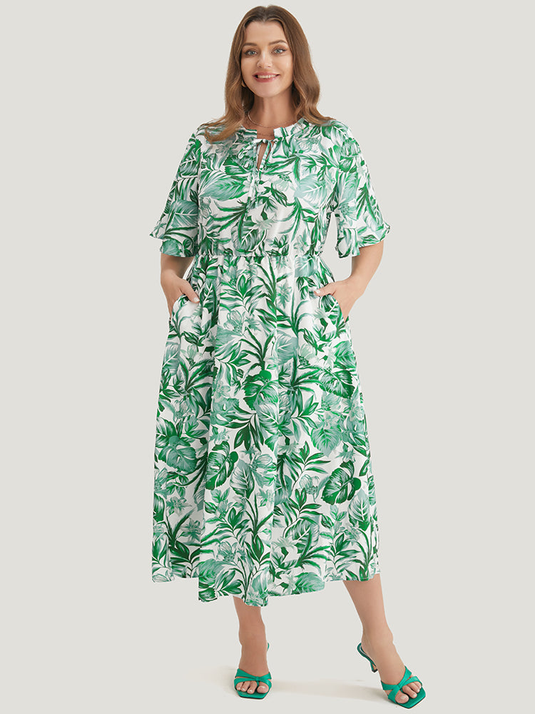 Plant Print Pocket Keyhole Tie Neck Frill Trim Flutter Dress