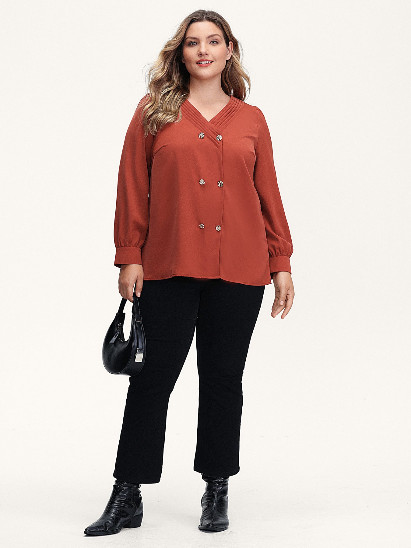 Pleated Neckline Metallic Buttons Blouse