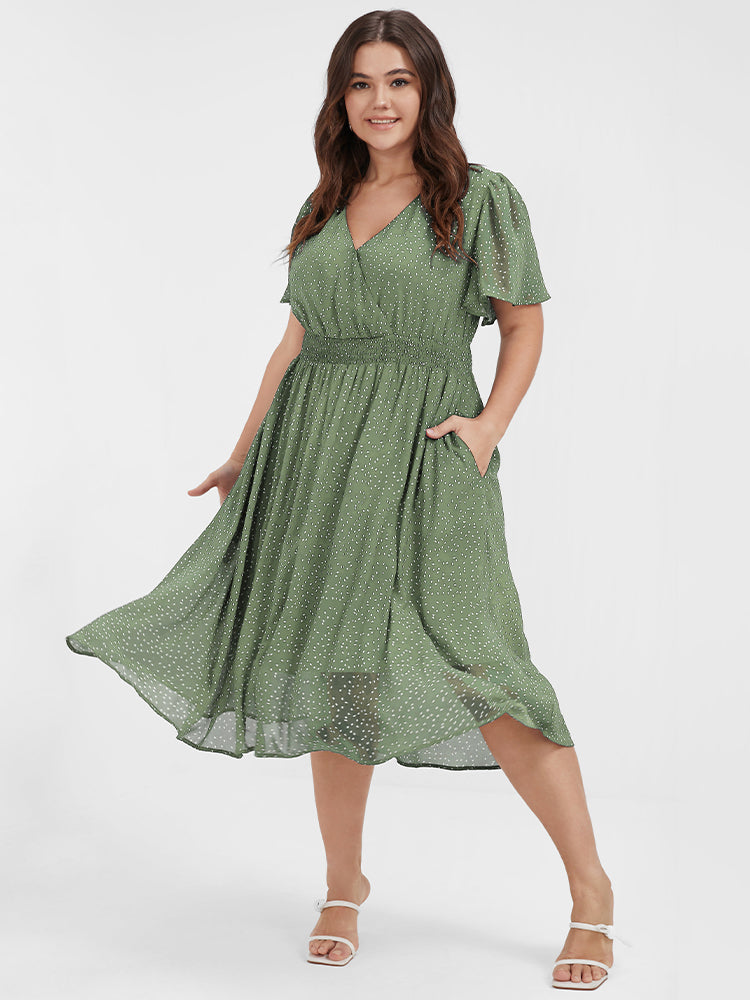 Polka Dot Button Pocket Shirred Ruffles Wrap Dress