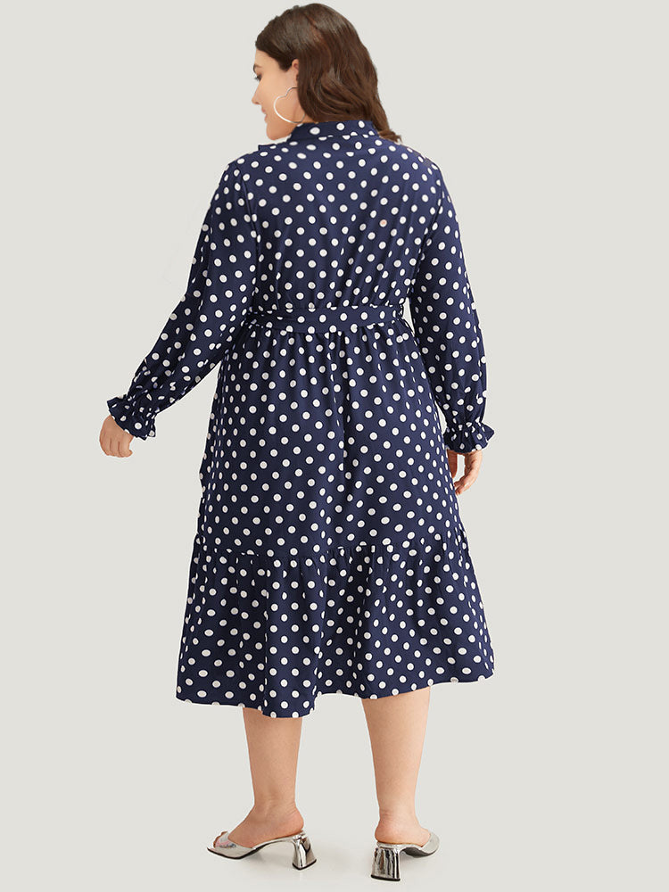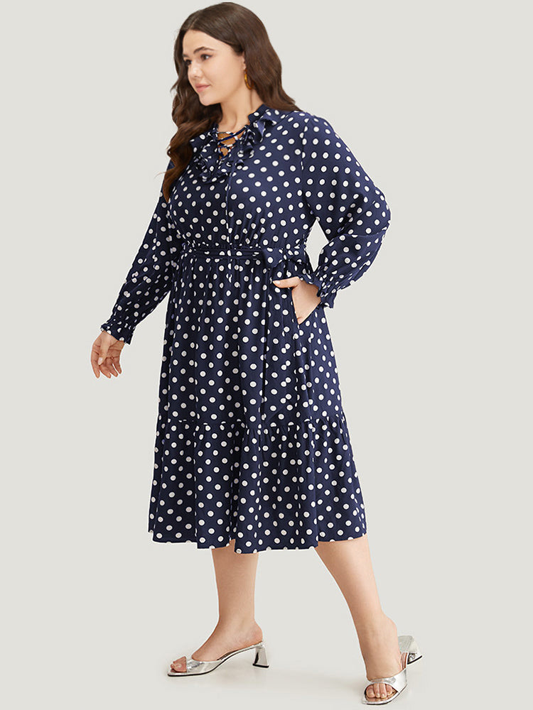 Polka Dot Ruffle Trim Belted Lace Up Dress