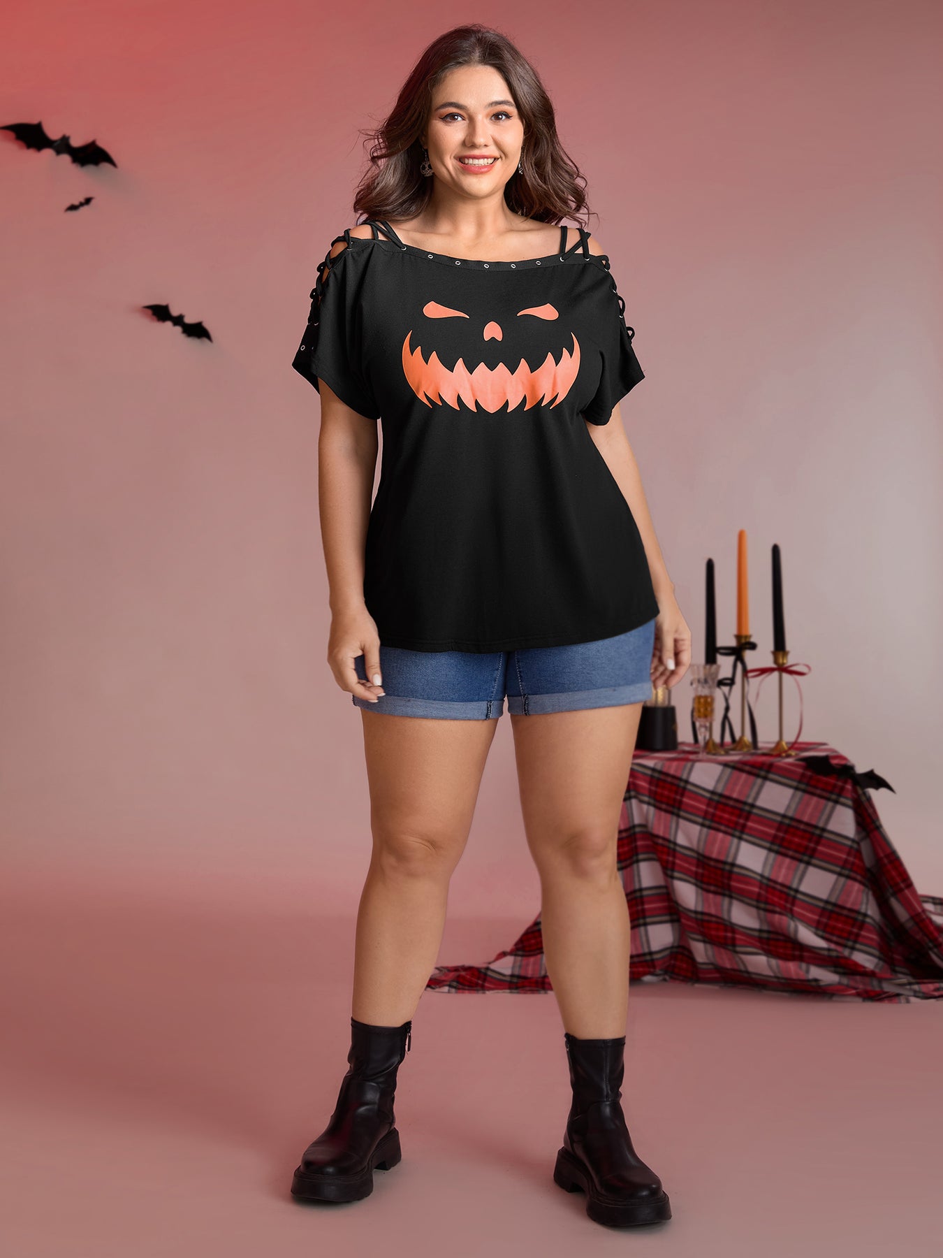 Pumpkin Motif Strap Loop Shoulder T-Shirt