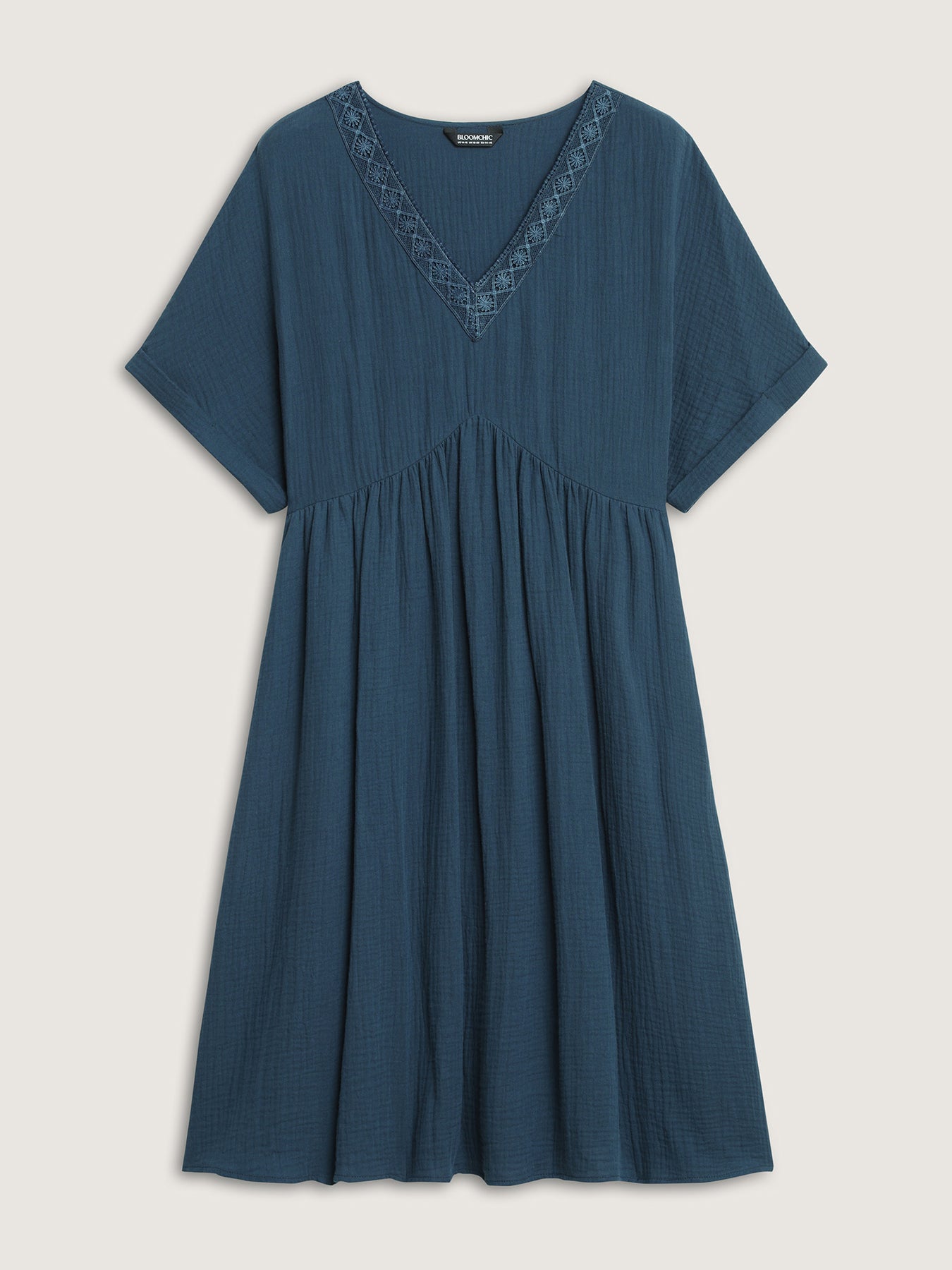 Pure Cotton Lace V-Neck Solid Midi Dress