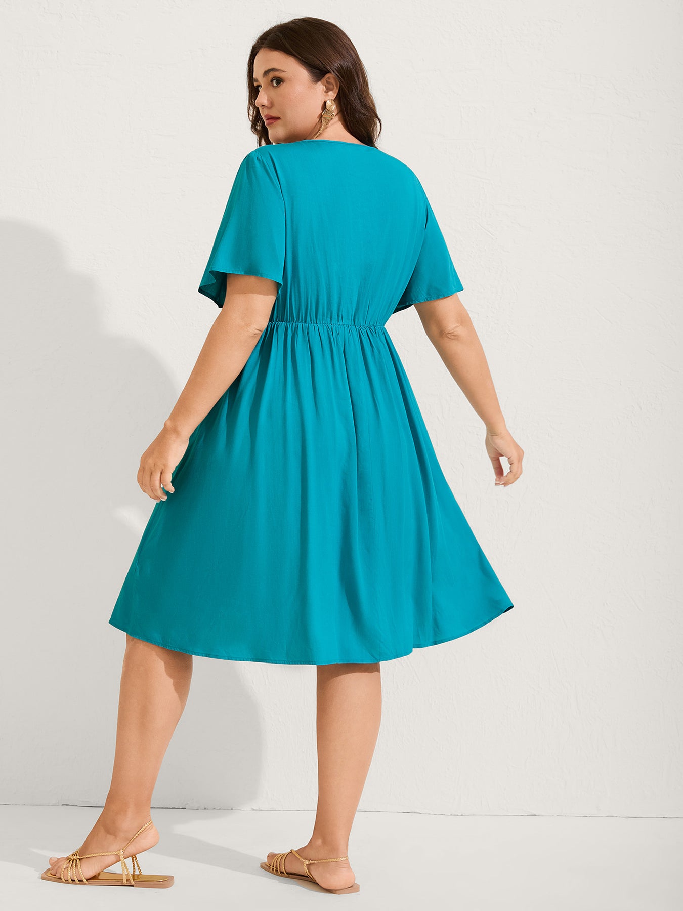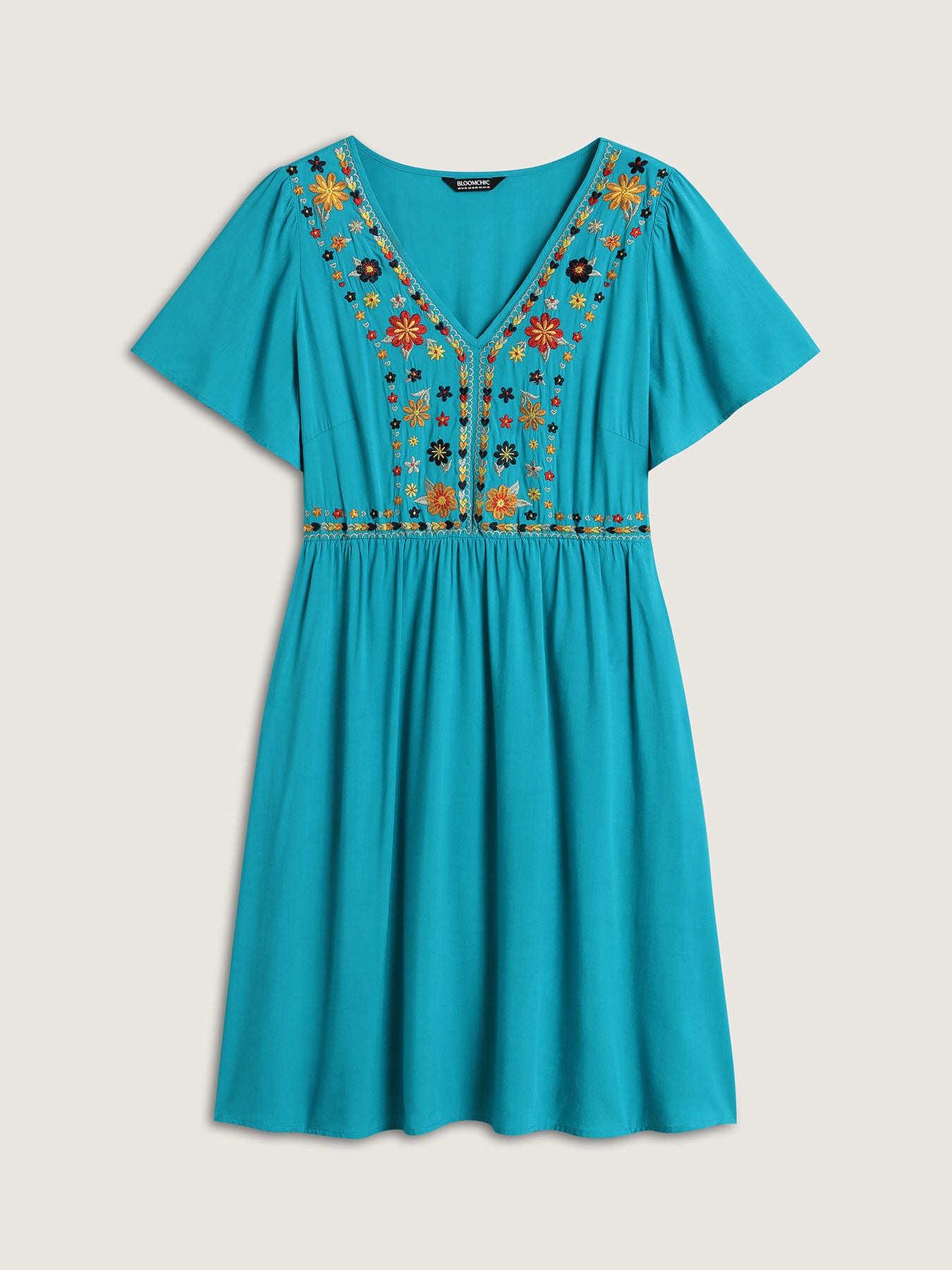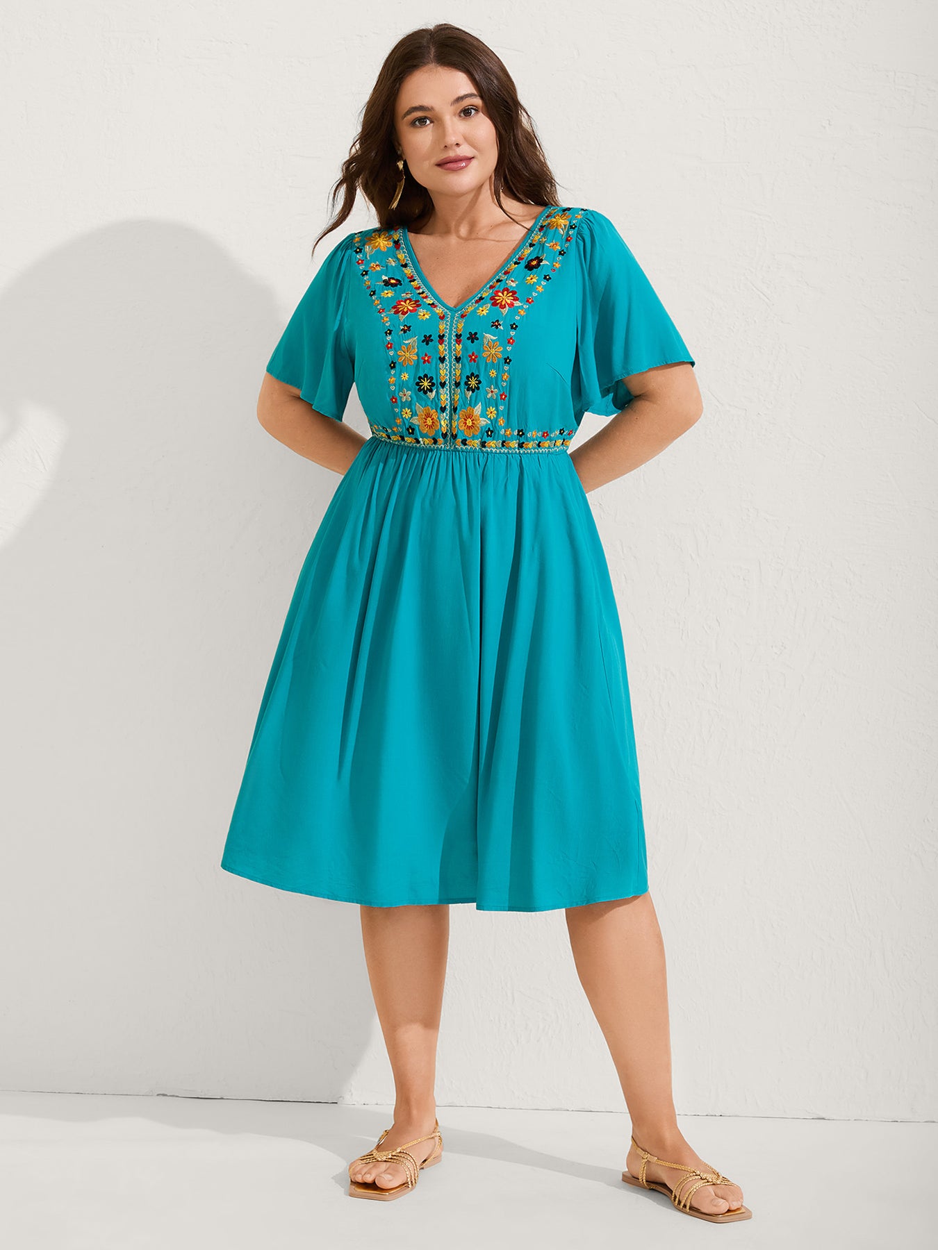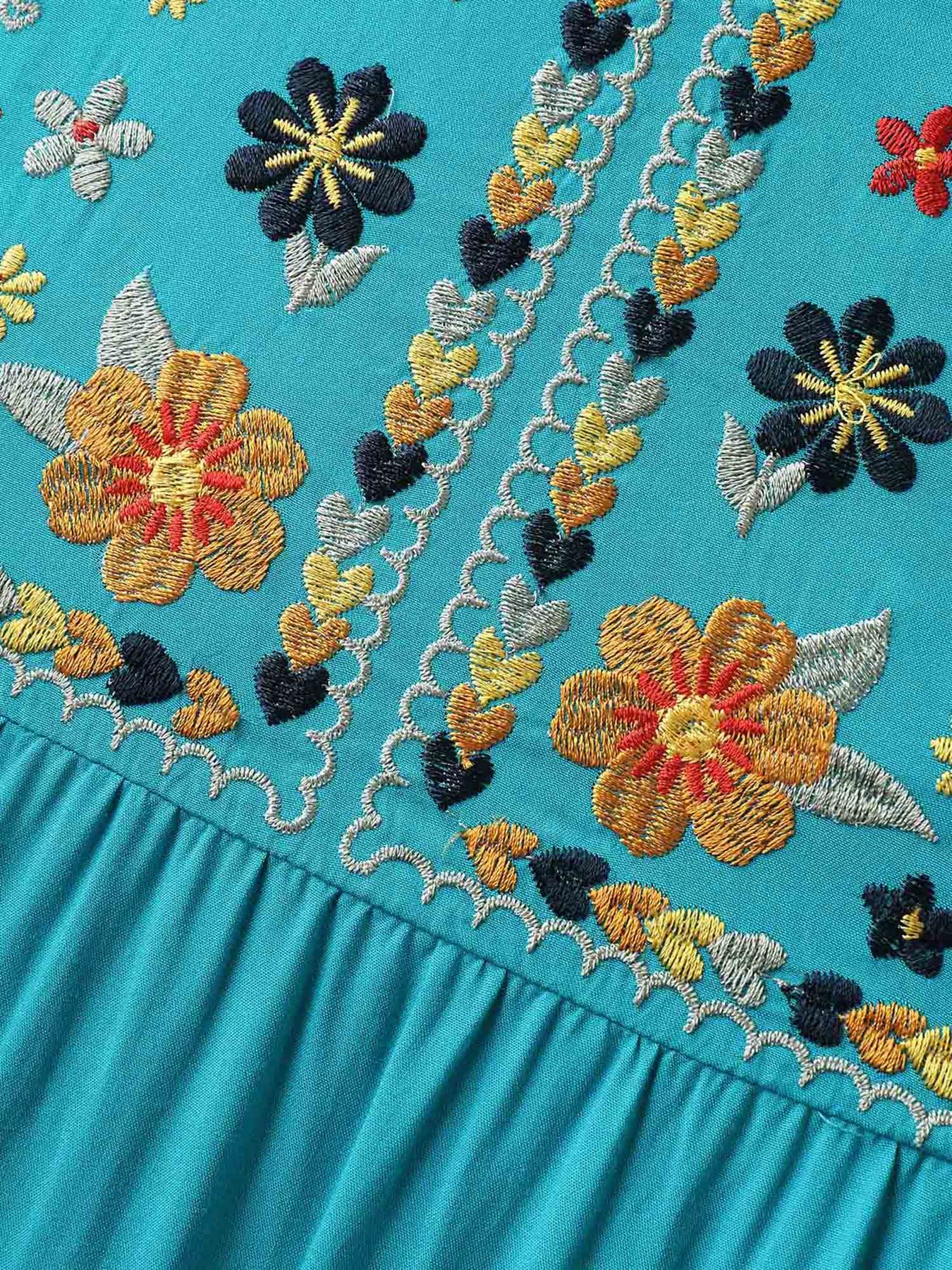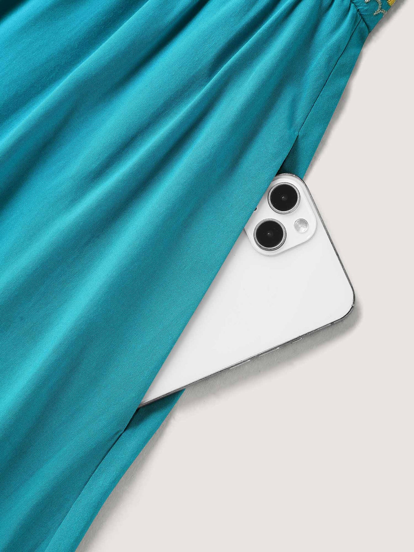 Rayon Floral Embroidered Pockets Midi Dress