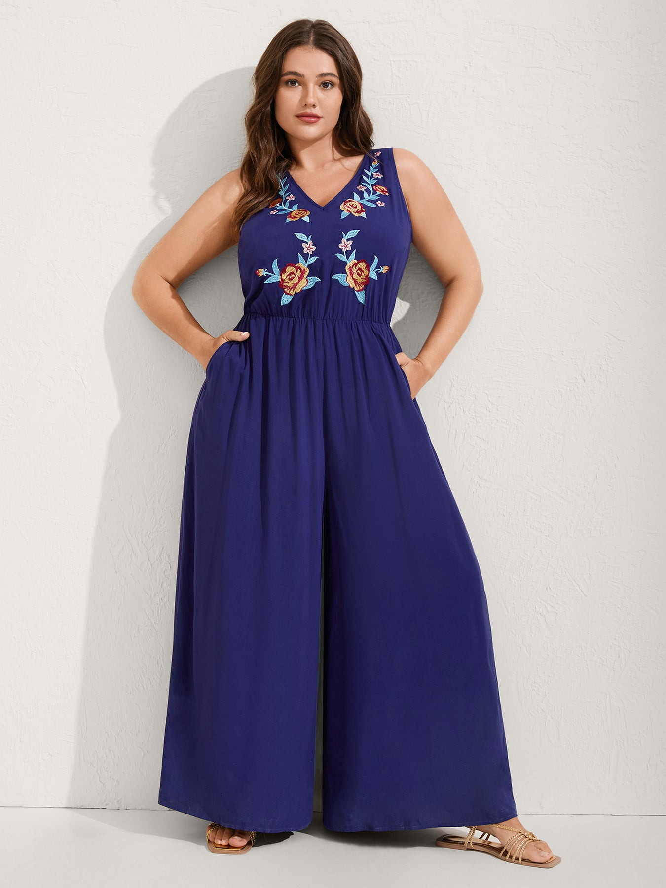 Rayon Floral Embroidery Stretchy Waist Jumpsuit