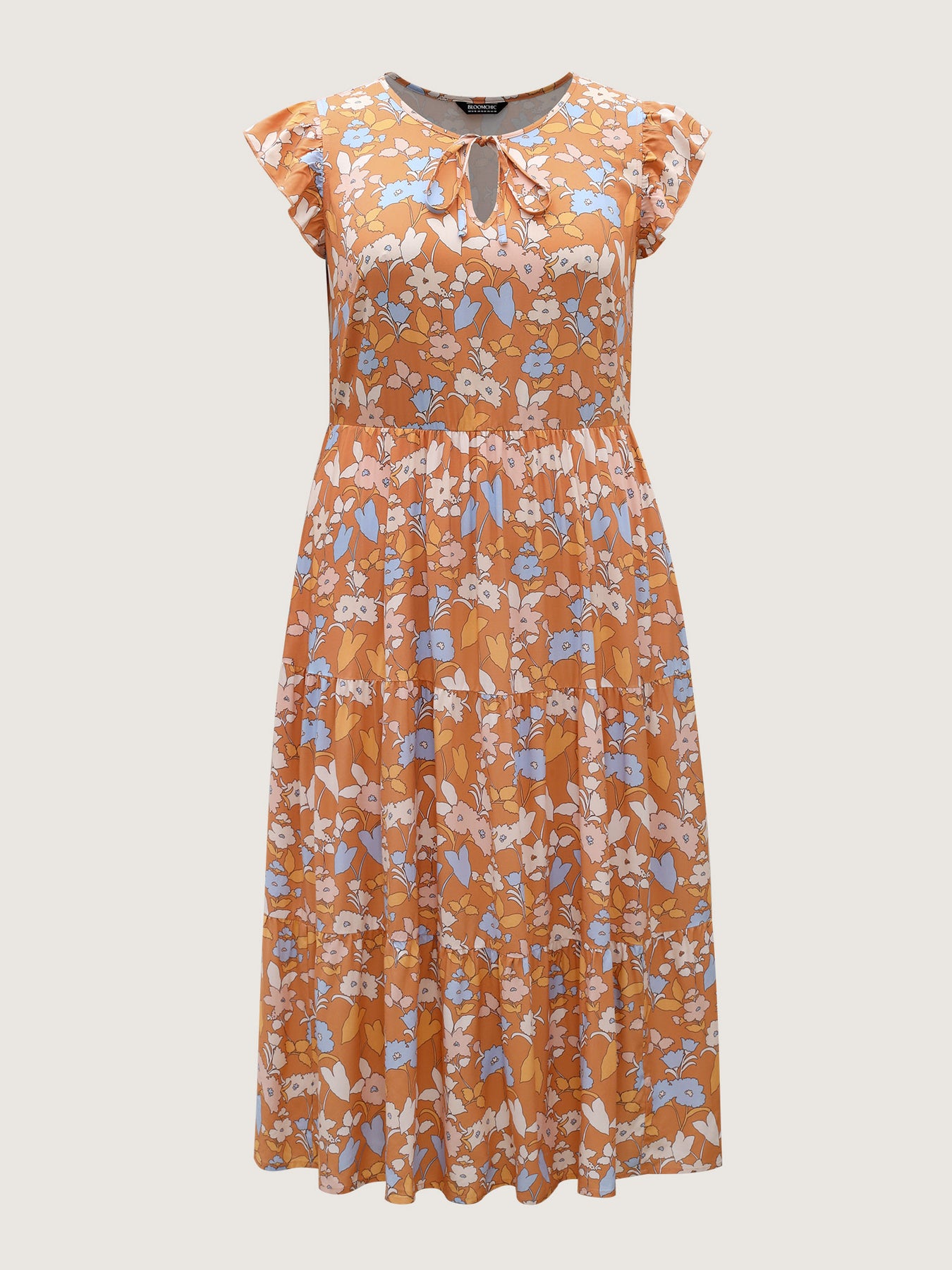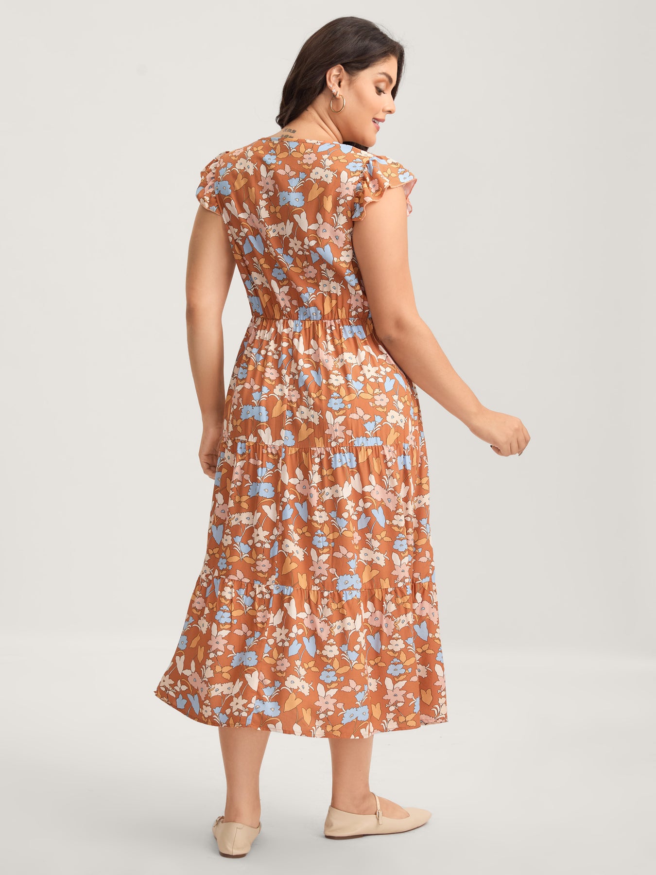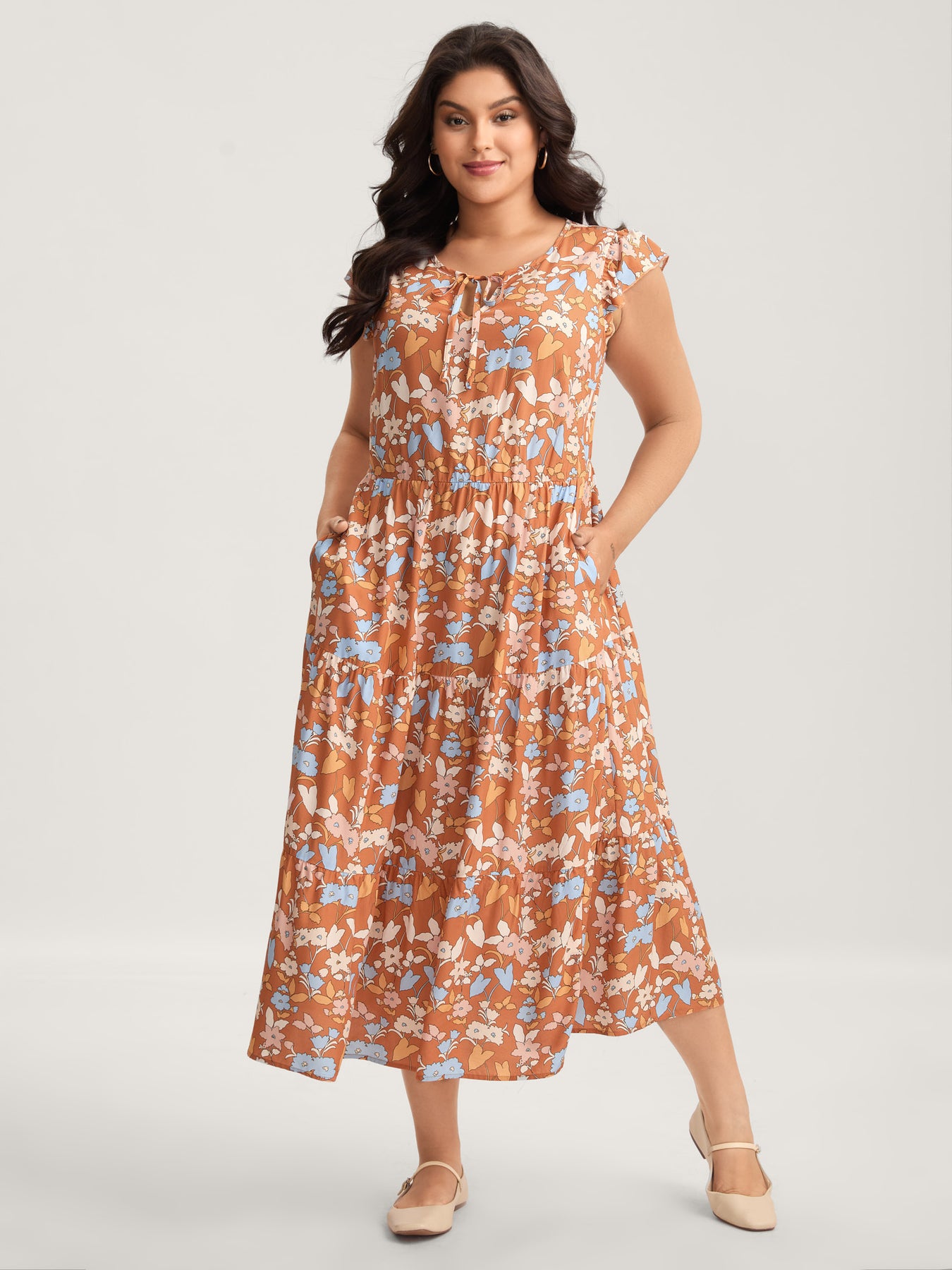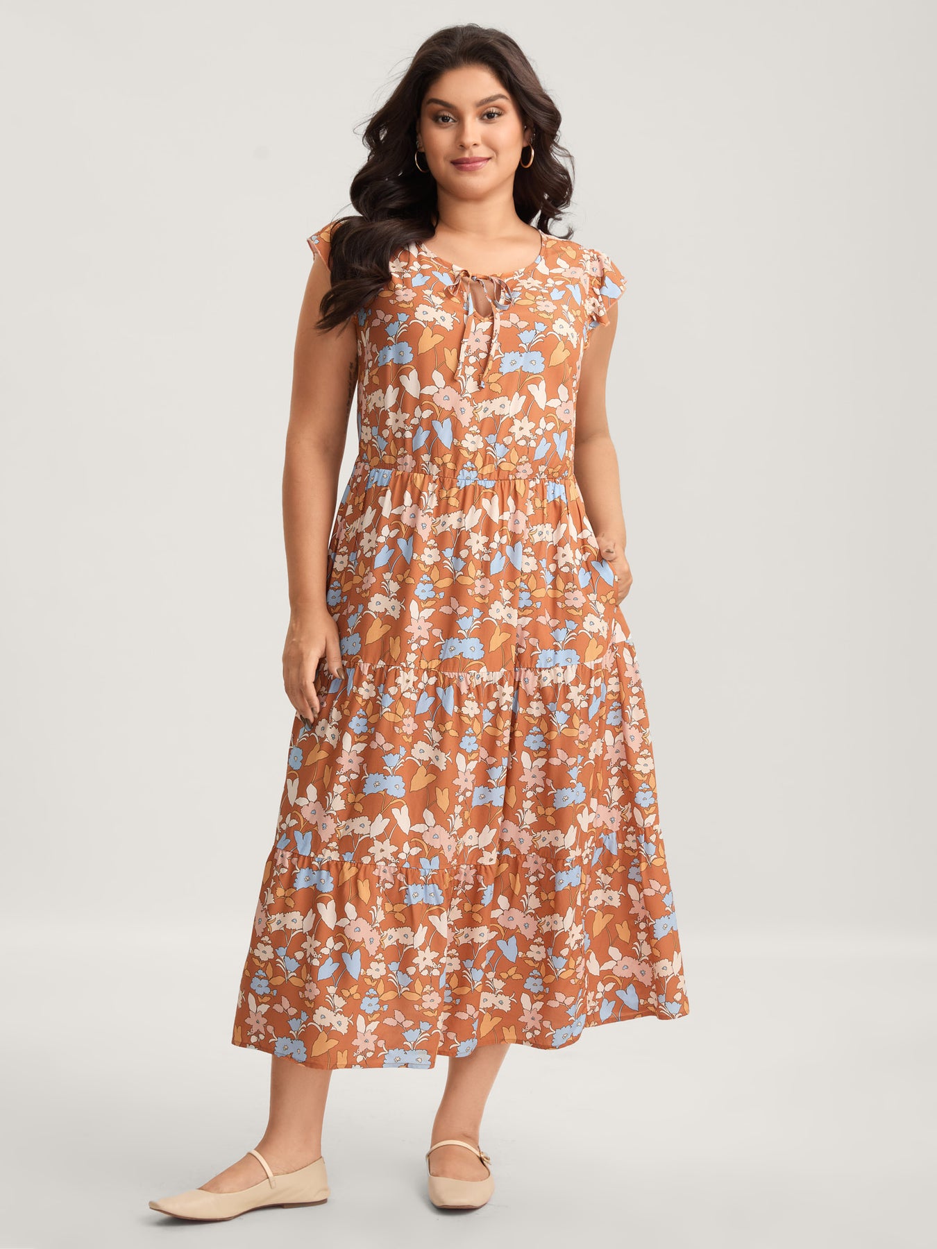 Rayon Floral Stretchy Waist Pockets Midi Dress