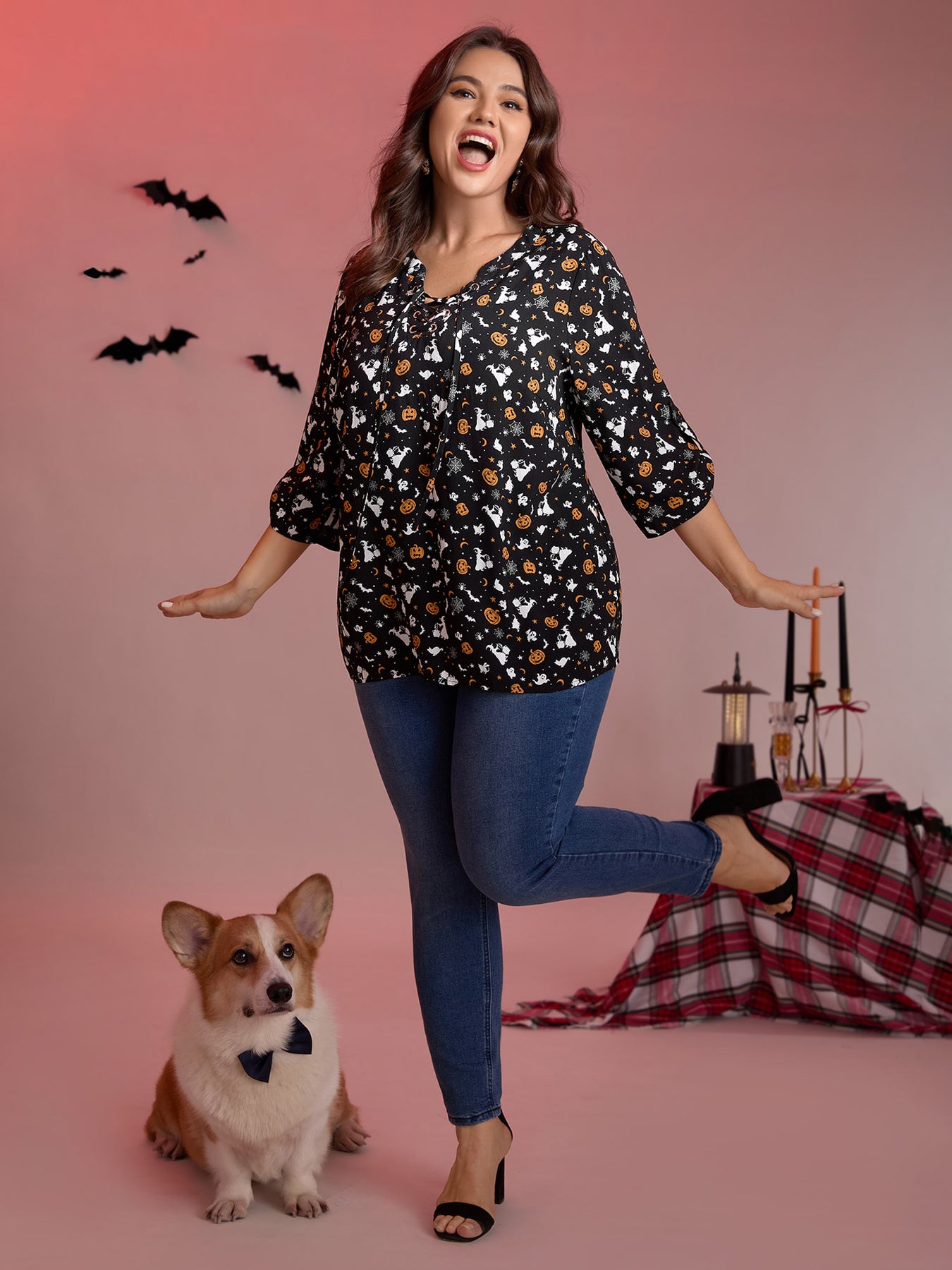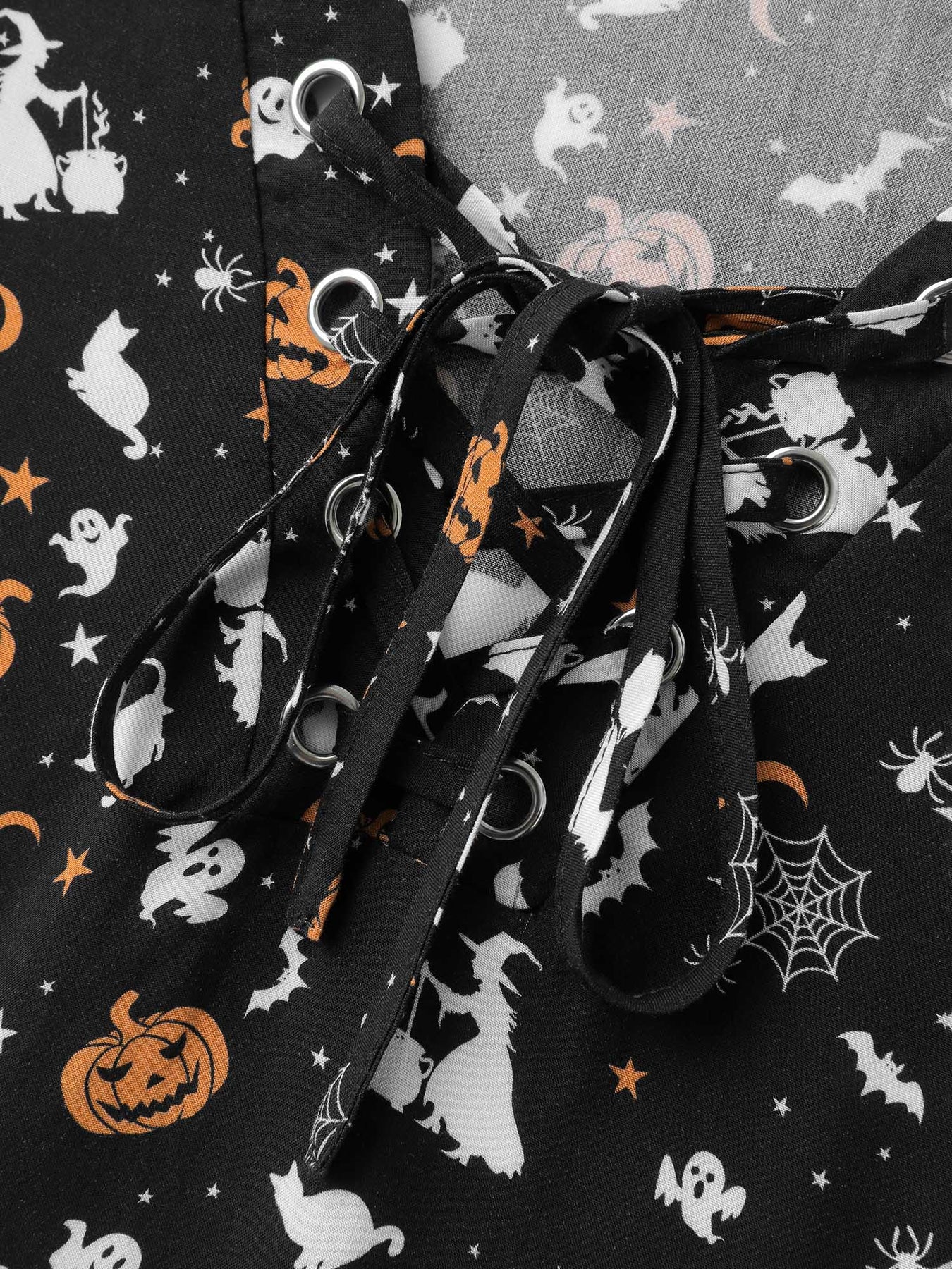 Rayon Halloween Print Neck Tie-Up Blouse