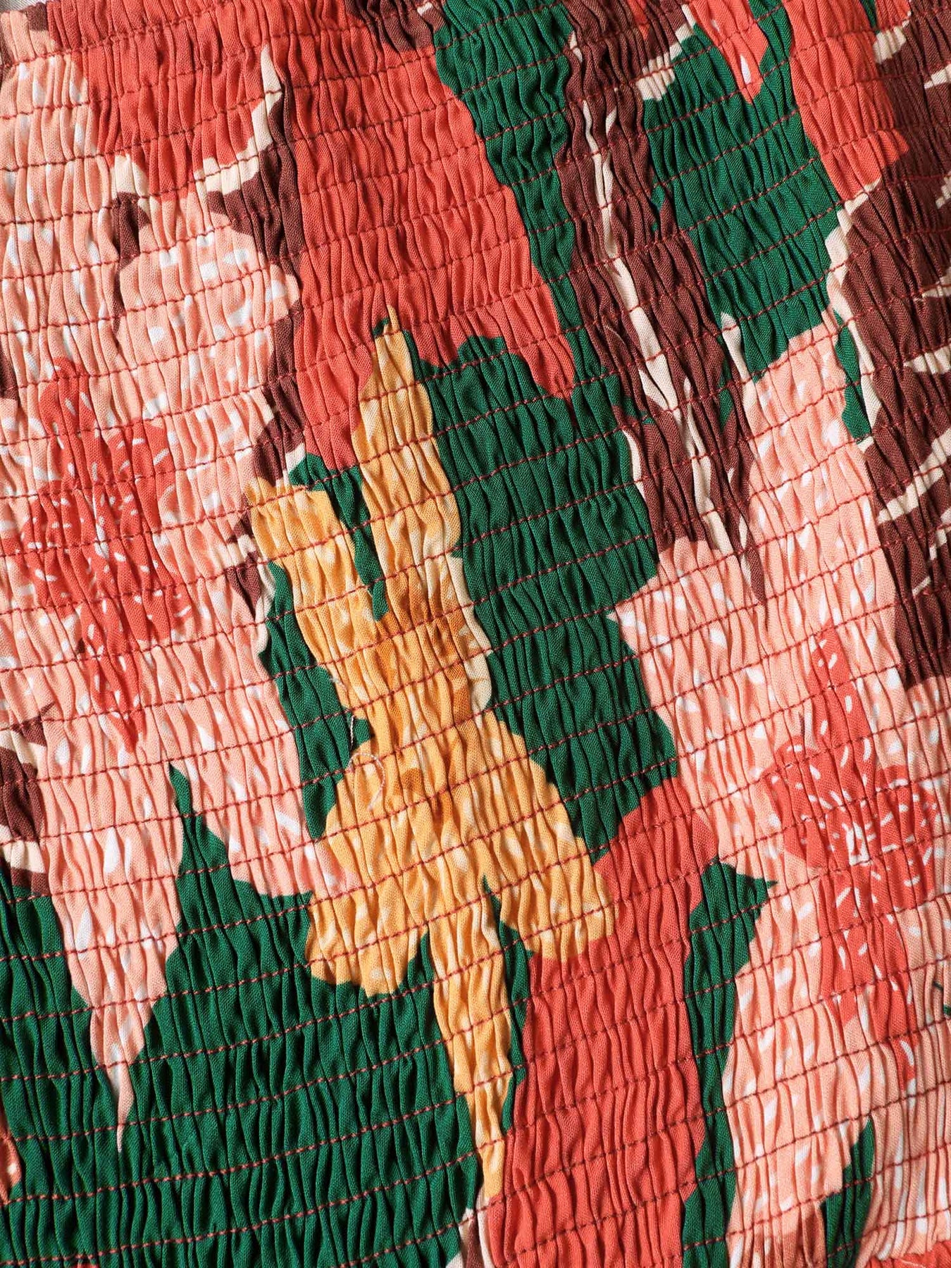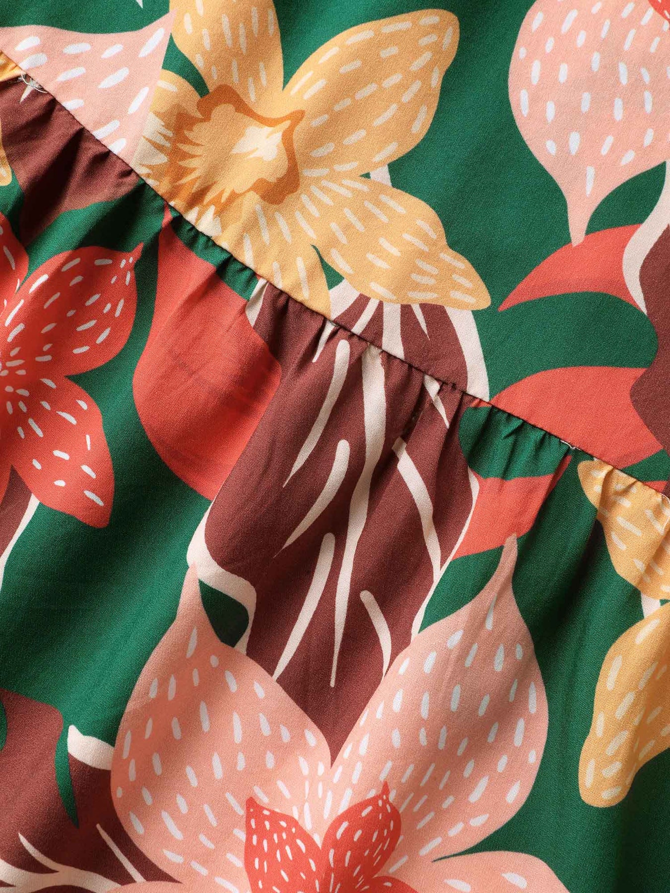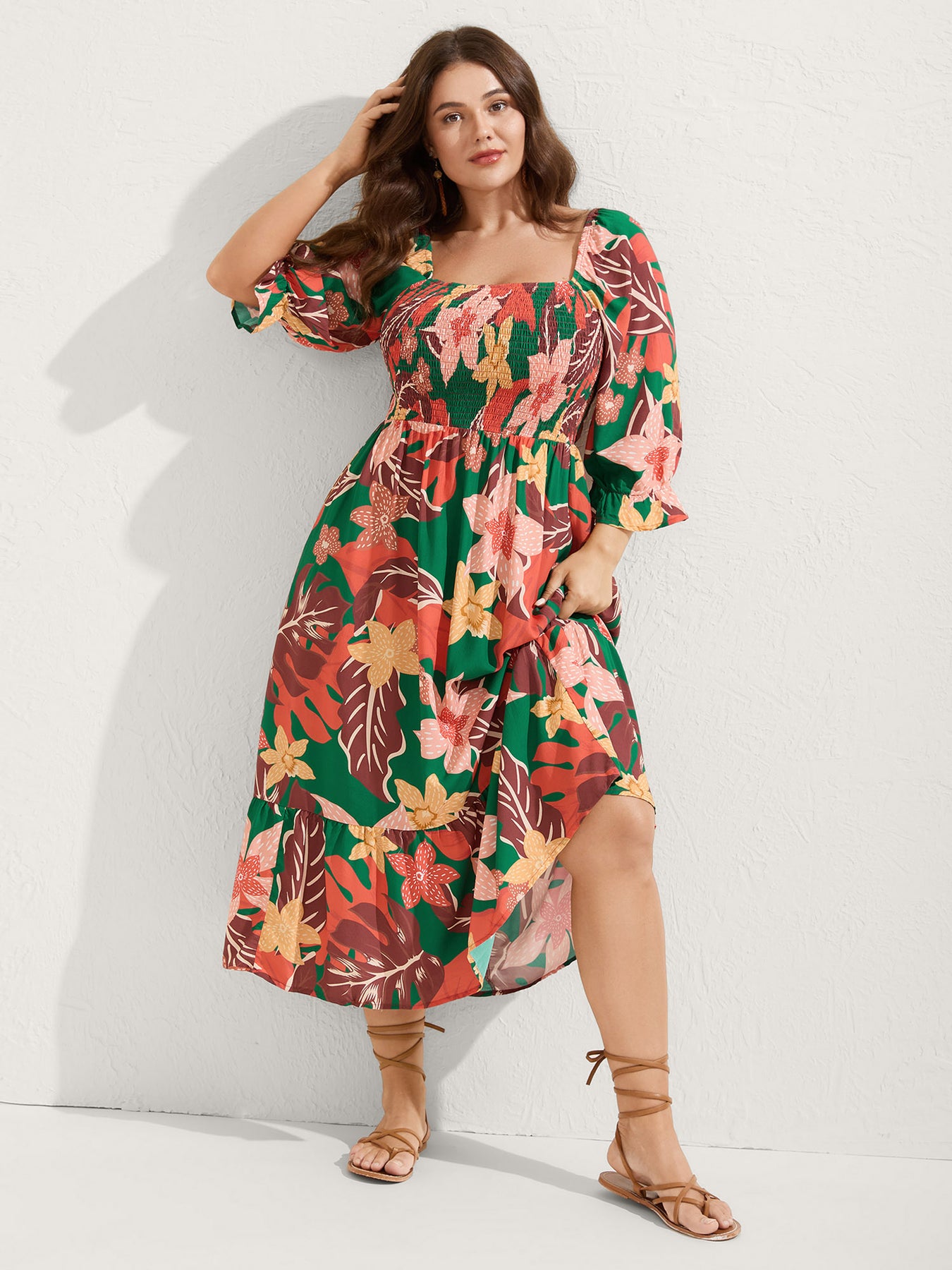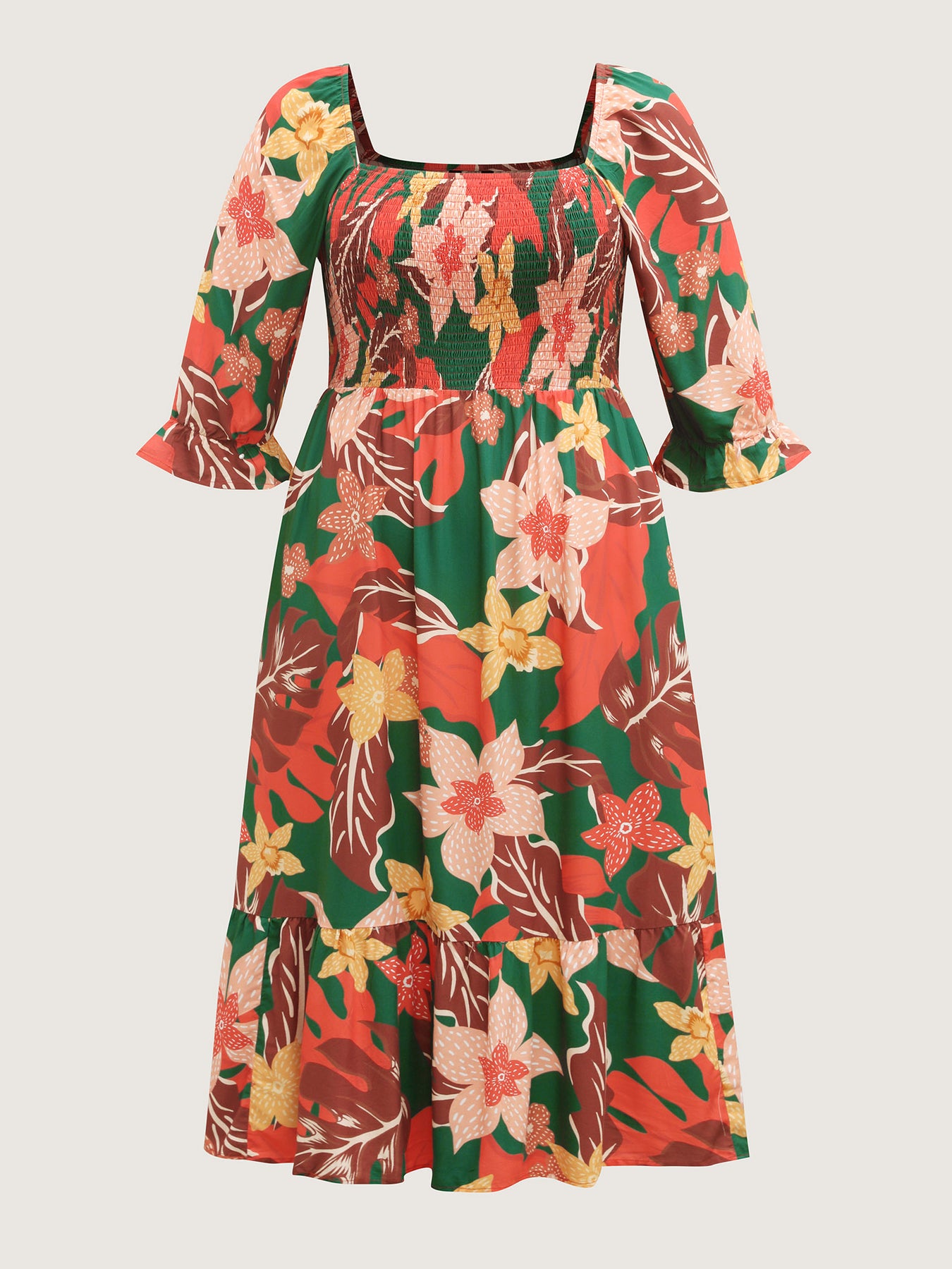 Rayon Tropical Floral Shirred Stretchy Waist Midi Dress