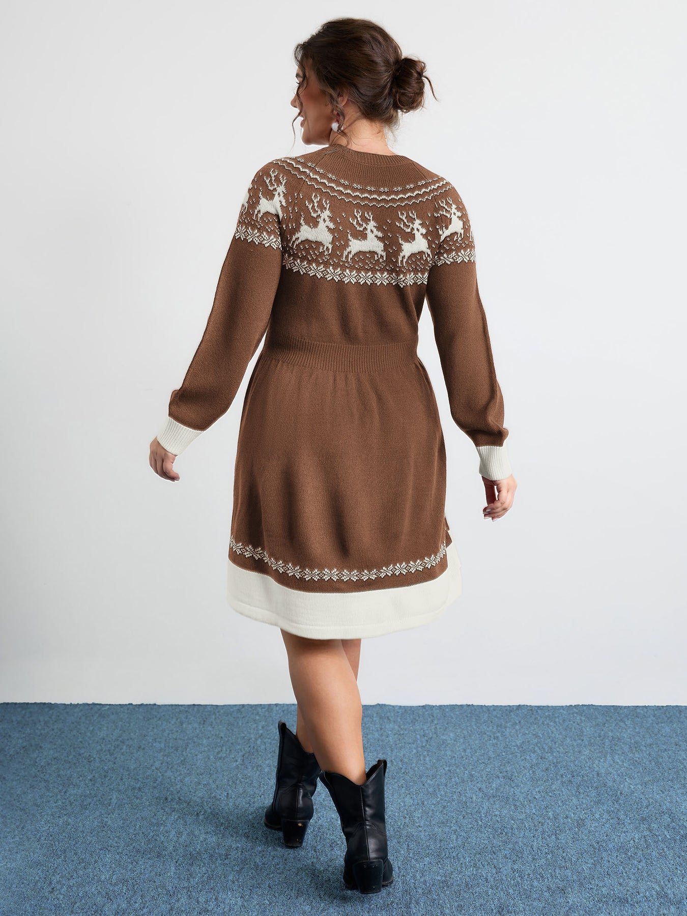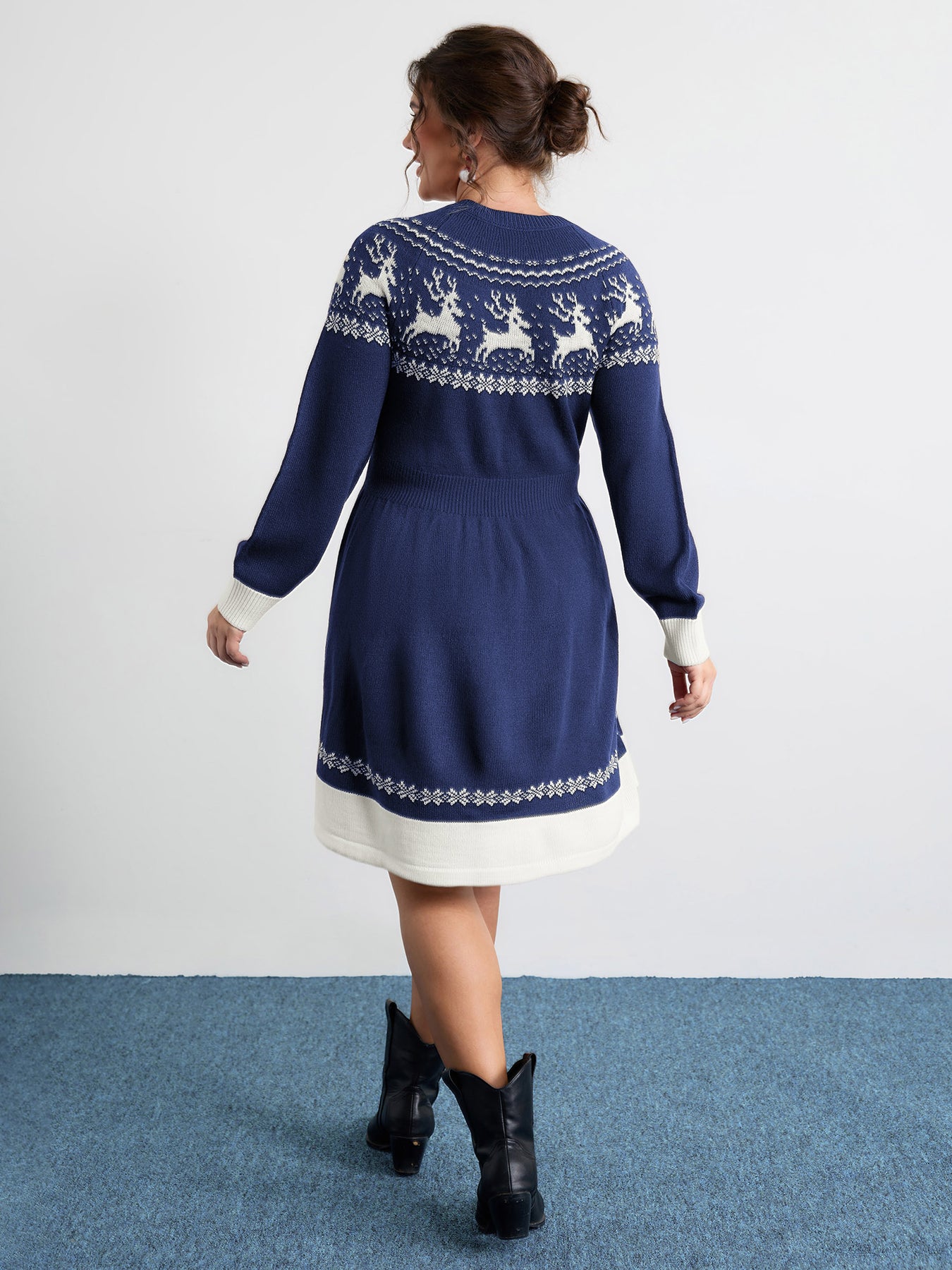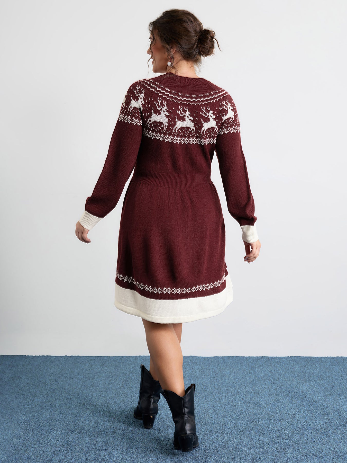 Reindeer Print Cinched-Waist Sweater Midi Dress
