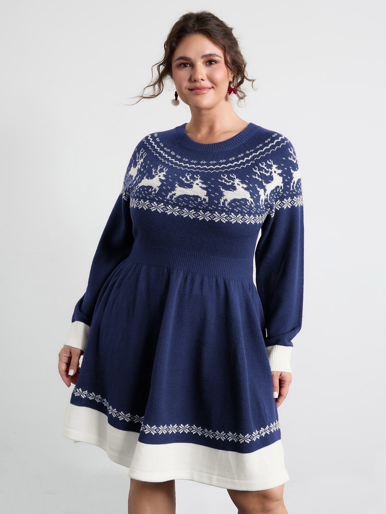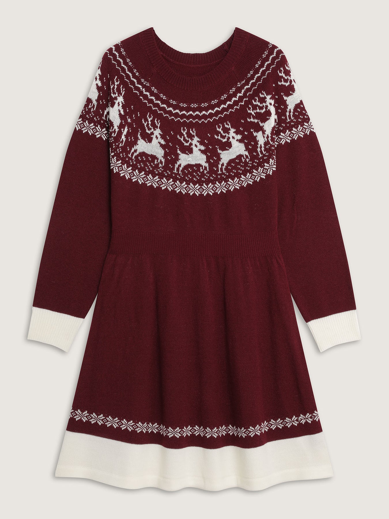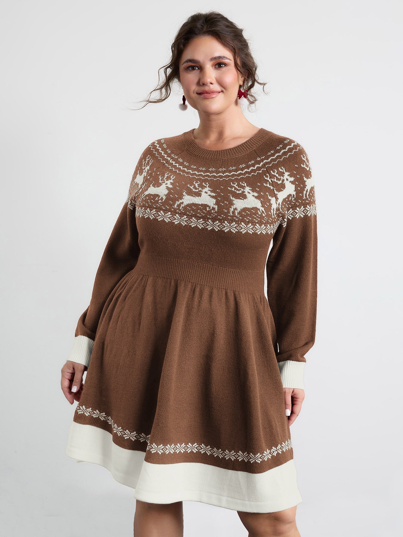 Reindeer Print Cinched-Waist Sweater Midi Dress