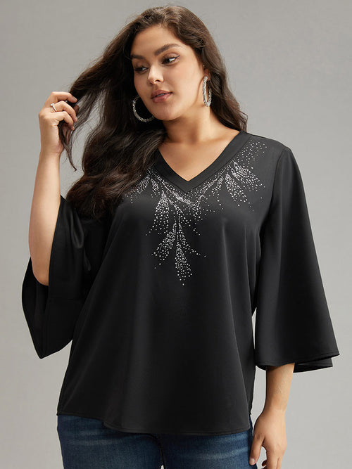Twill Rhinestone V Neck Ruffle Sleeve Blouse