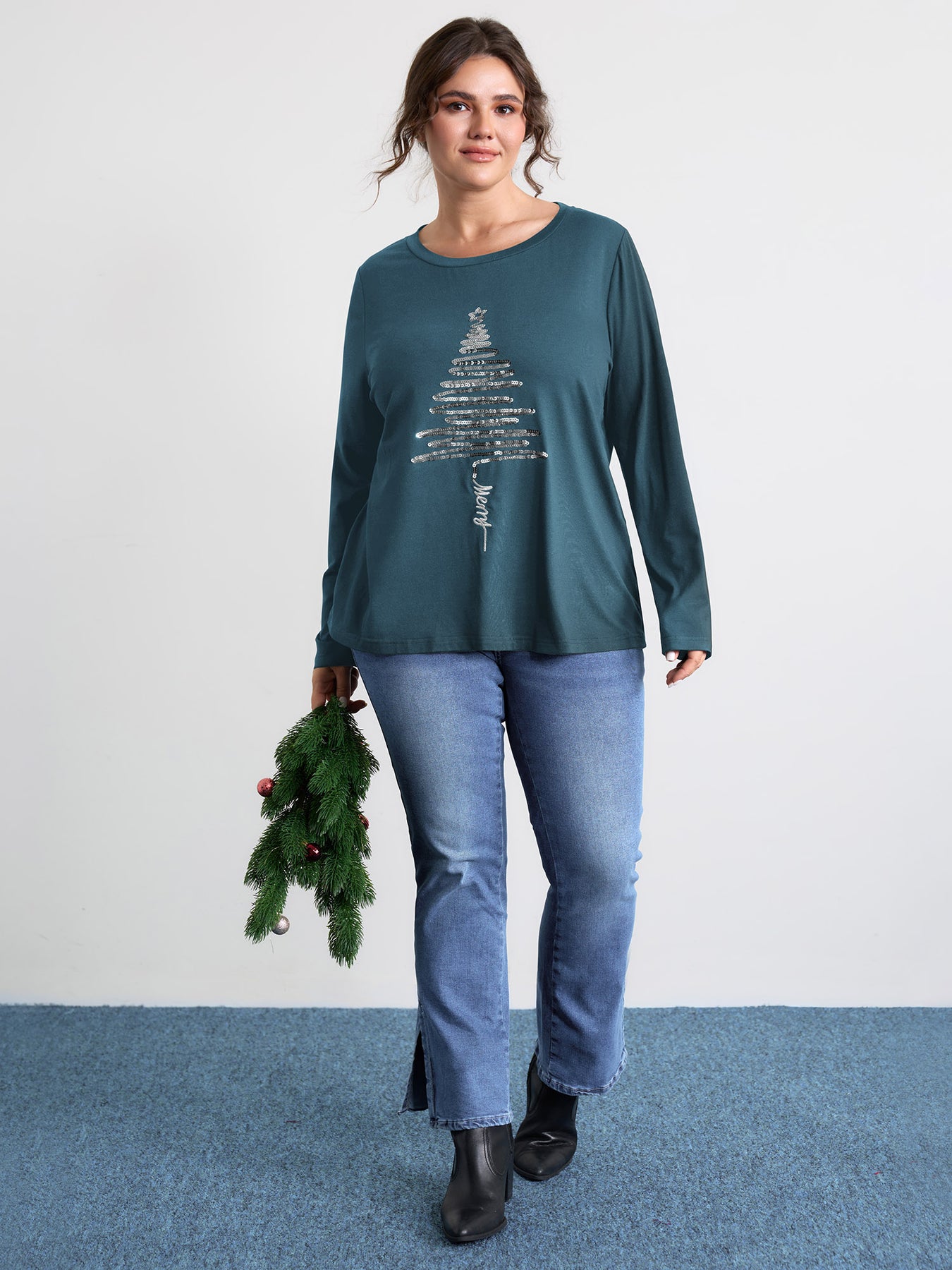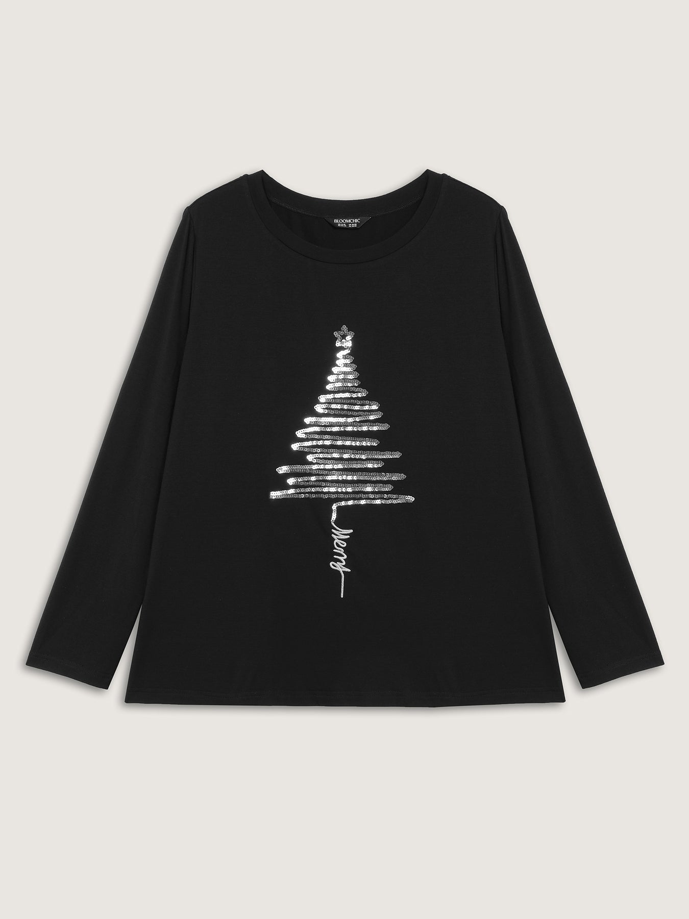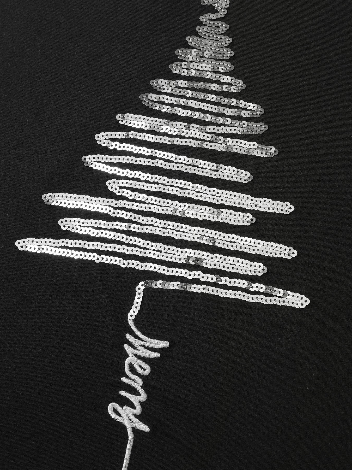 Sequin Cord Embroidered Tree Round Neck T-Shirt