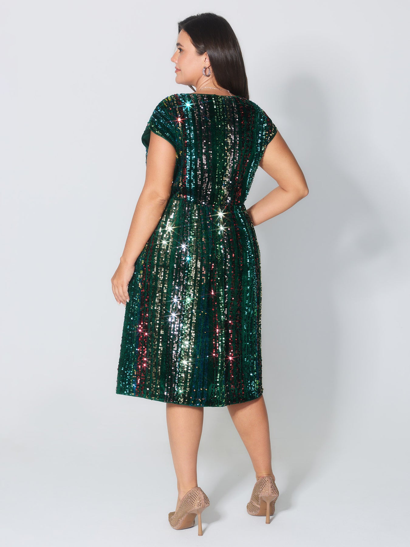 Shimmery Sequin Stripe Cinched-Waist Midi Dress