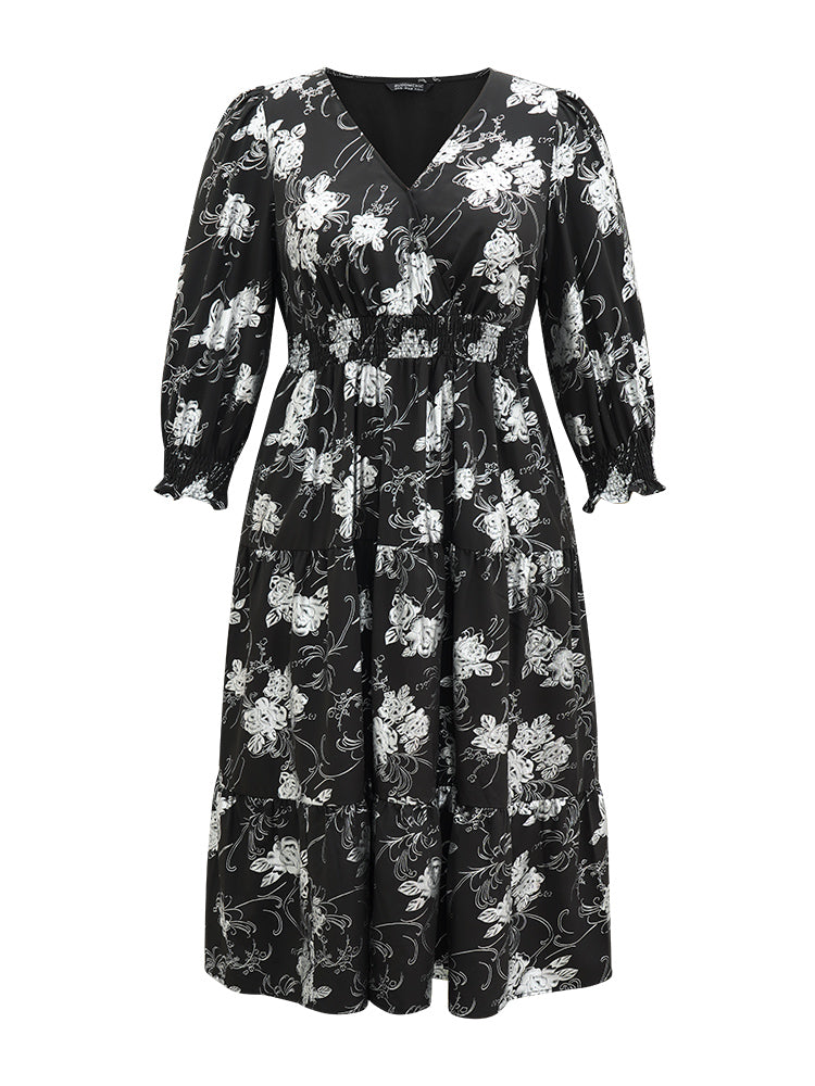 Silhouette Floral Print Glitter Wrap Shirred Dress