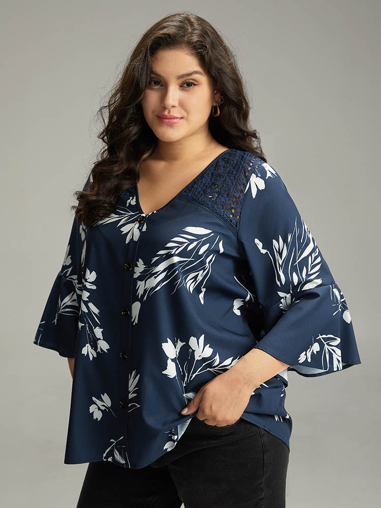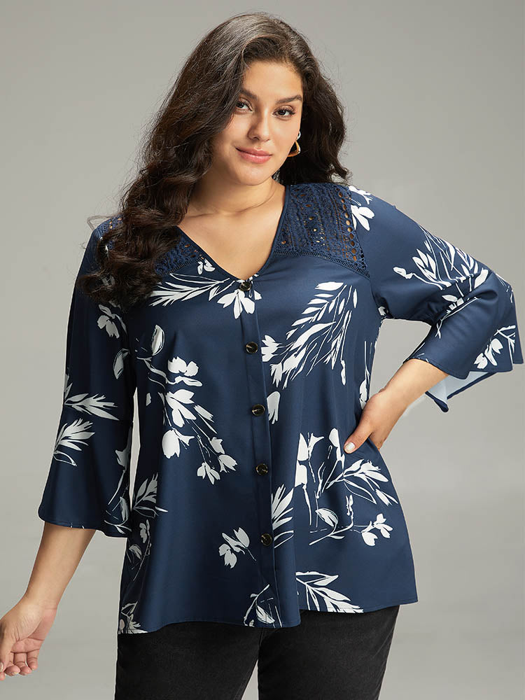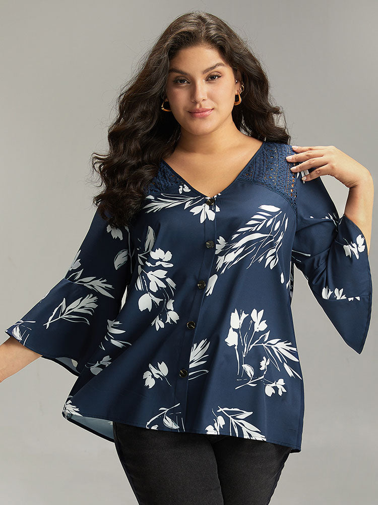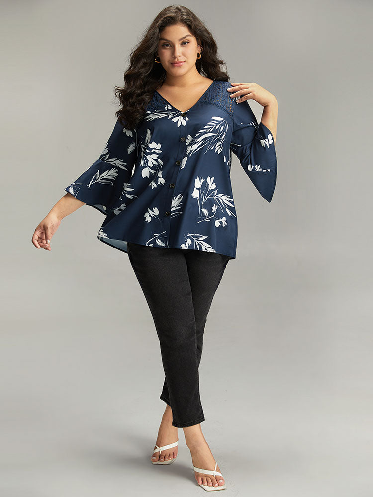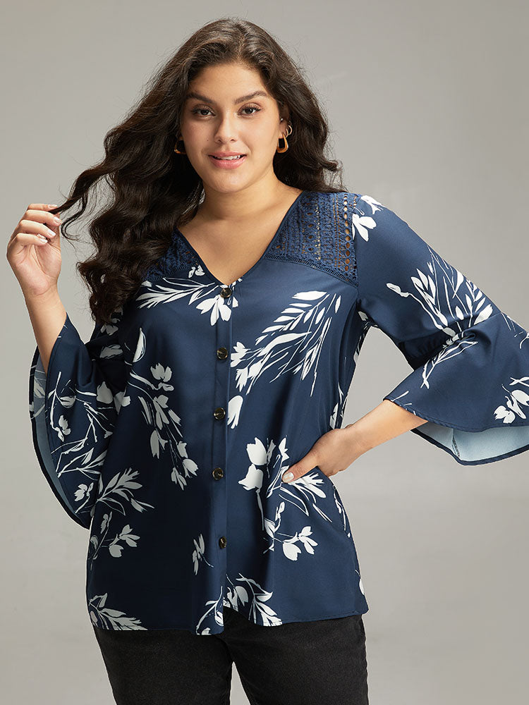 Silhouette Floral Print Guipure Lace Bell Sleeve Blouse