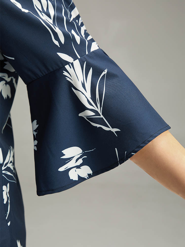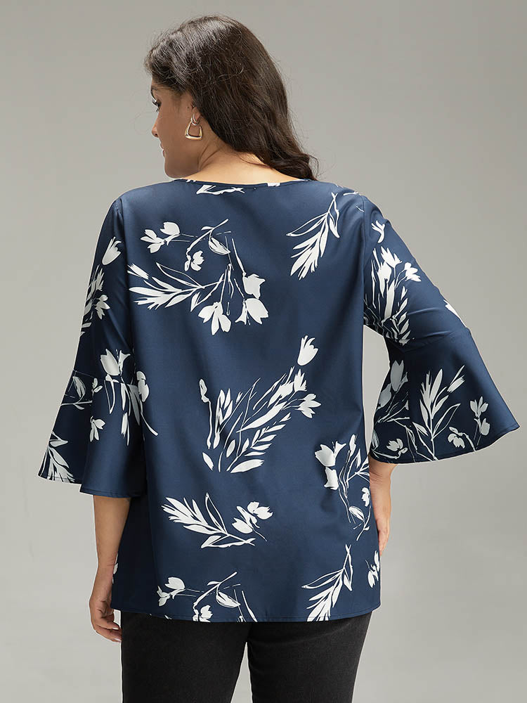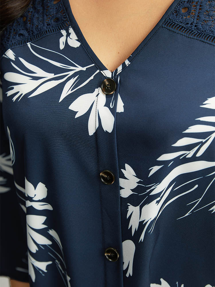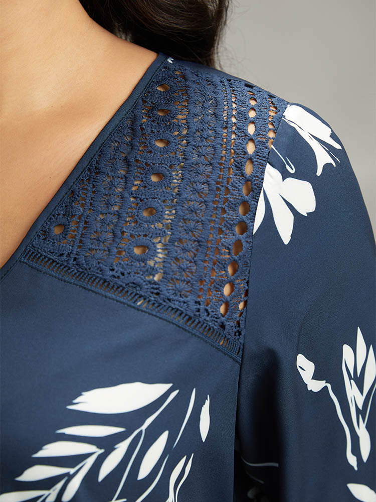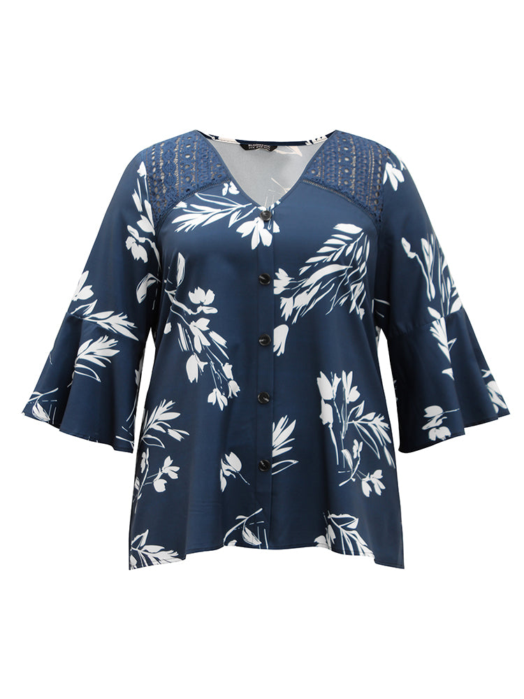 Silhouette Floral Print Guipure Lace Bell Sleeve Blouse