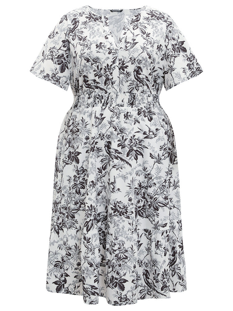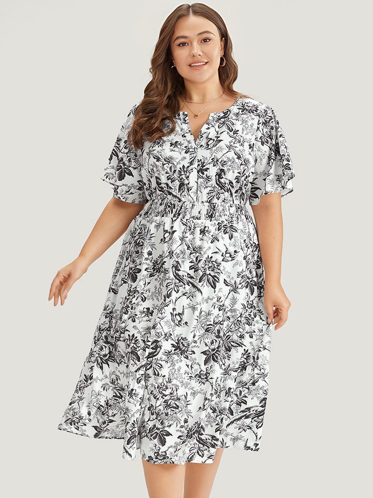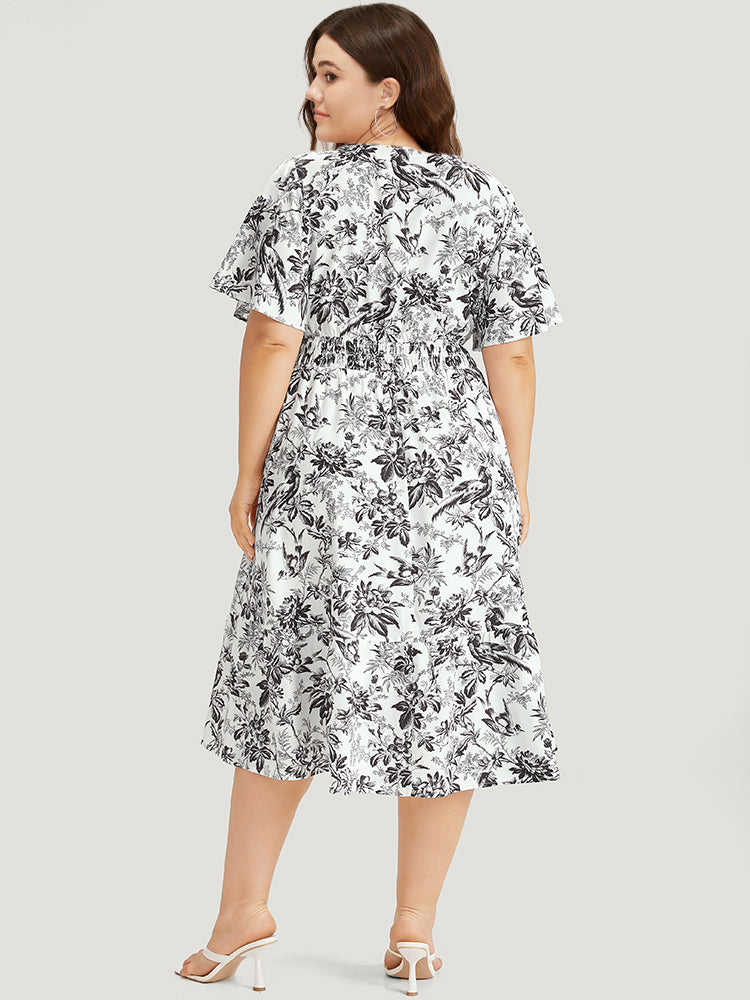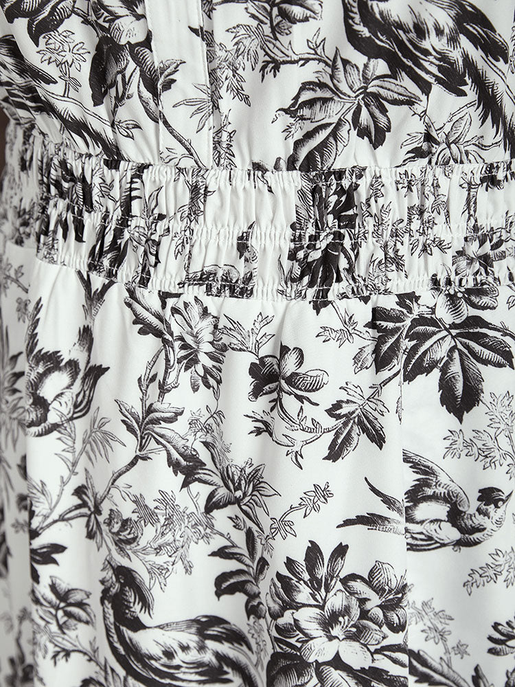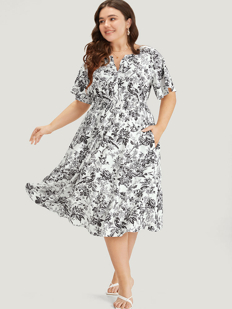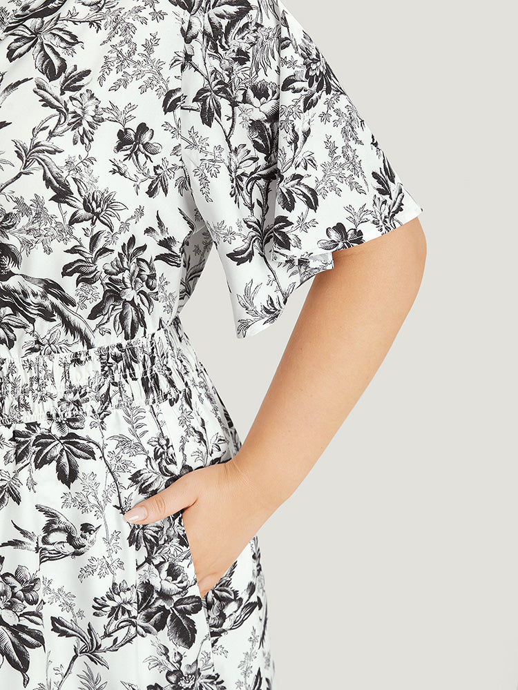 Silhouette Floral Print Shirred Notched Pocket Ruffles Dress