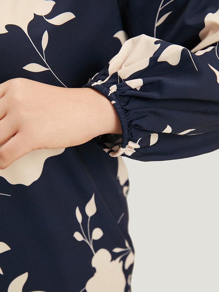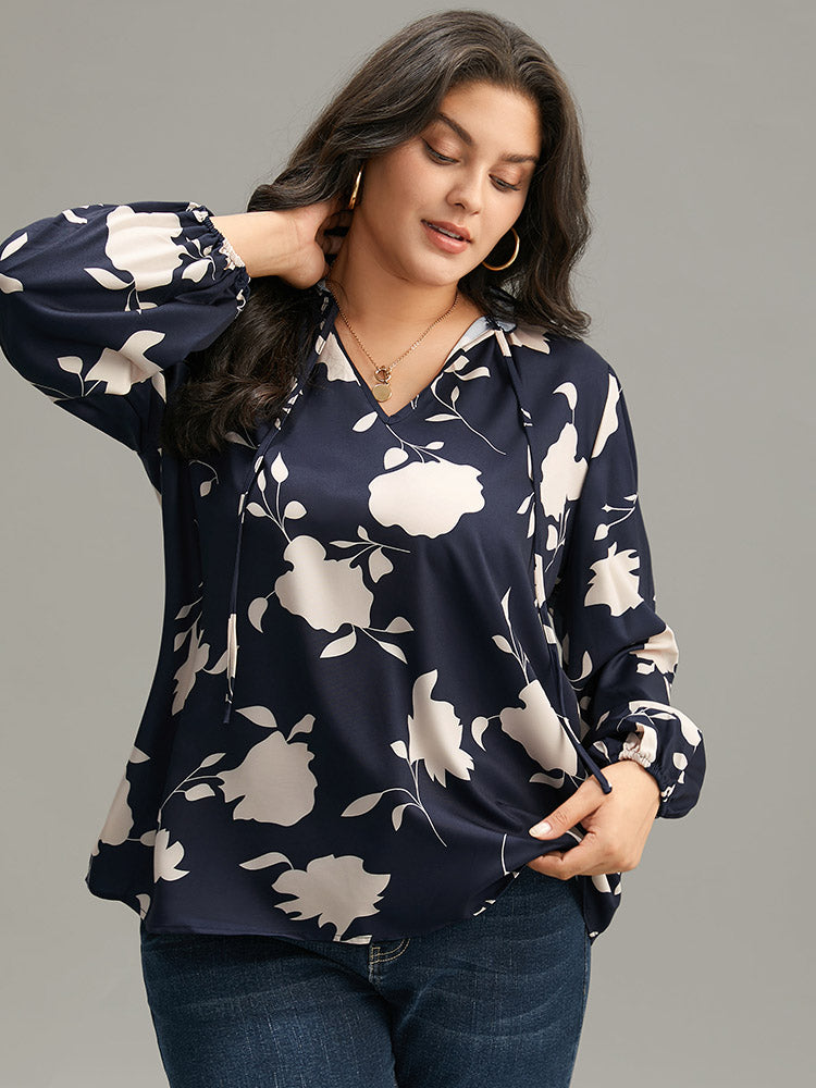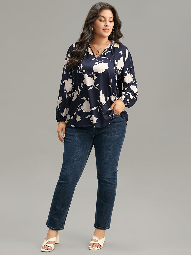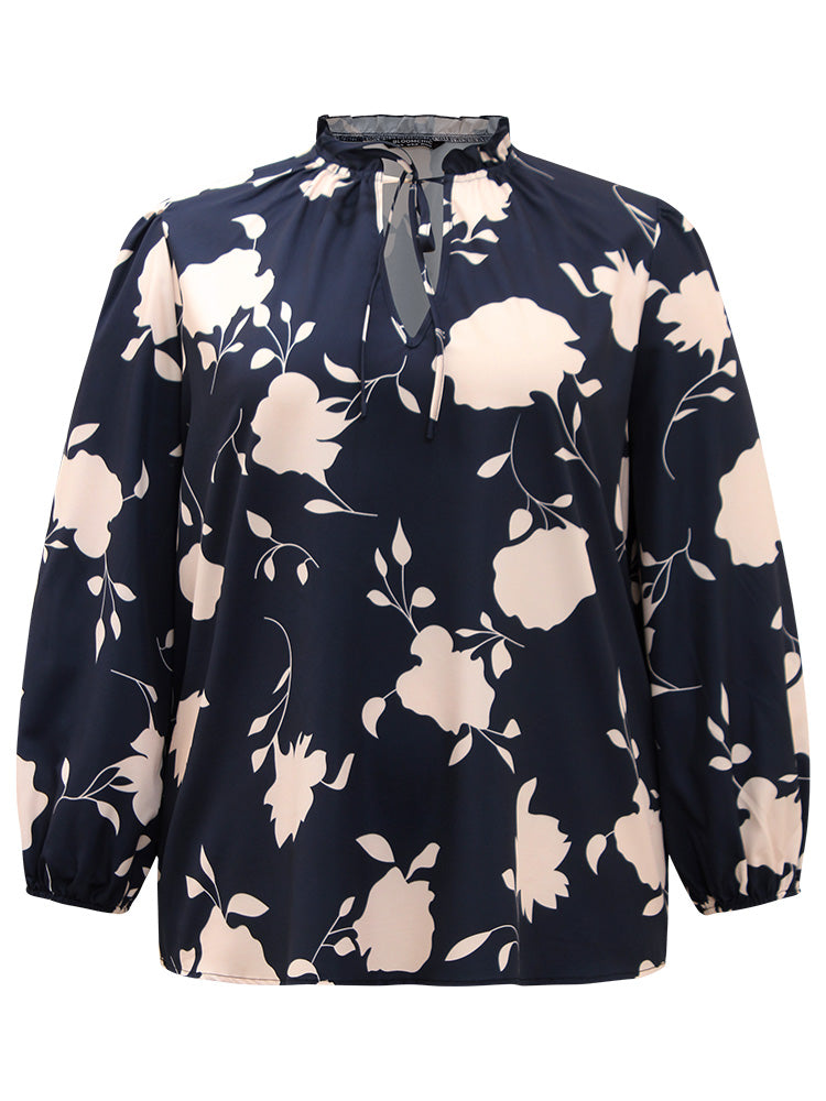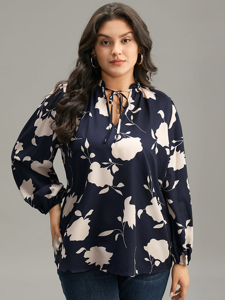 Silhouette Floral Print Stand Collar Tie Neck Blouse