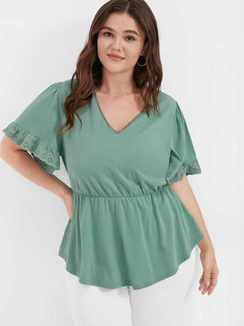 Solid Broderie Anglaise Flutter V Neck T-shirt