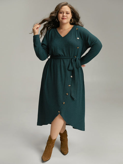 Rib Knit Button Detail Belted Wrap Hem Dress