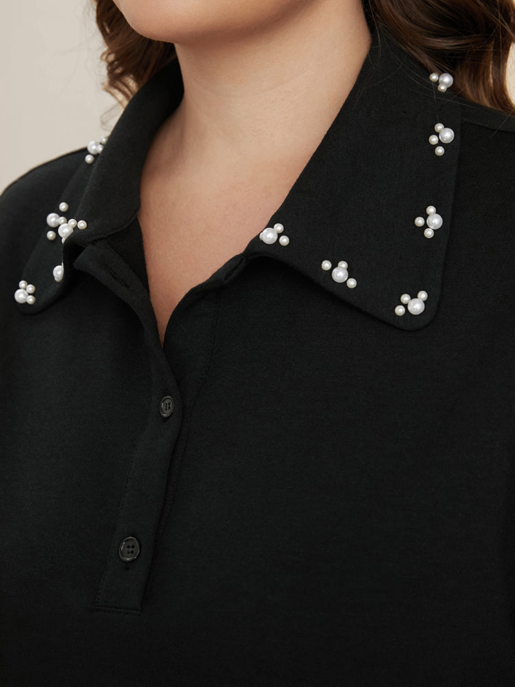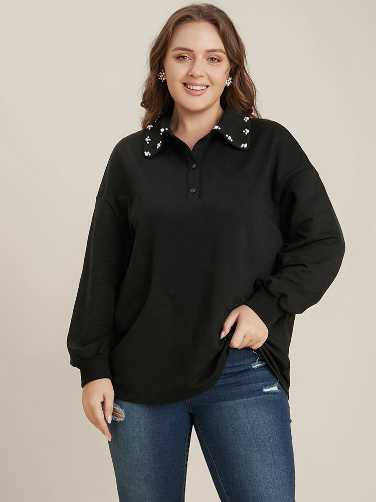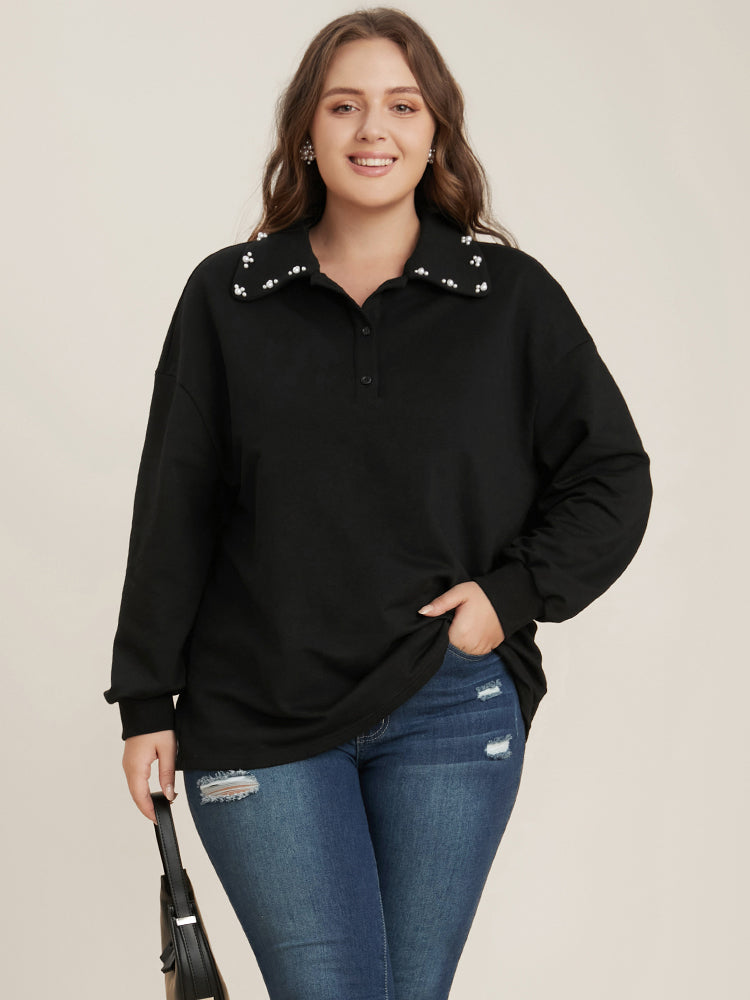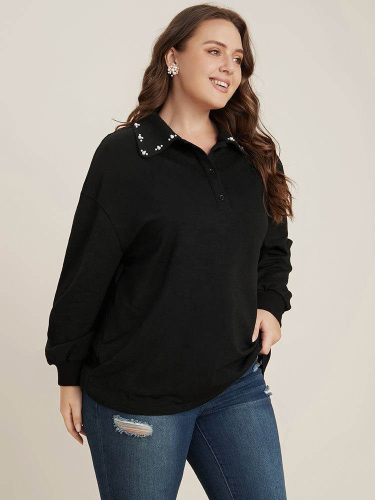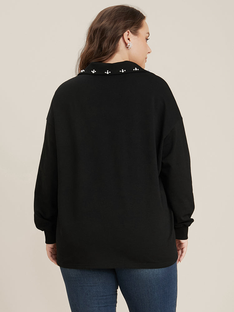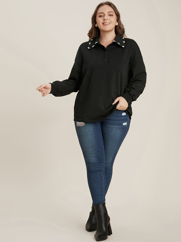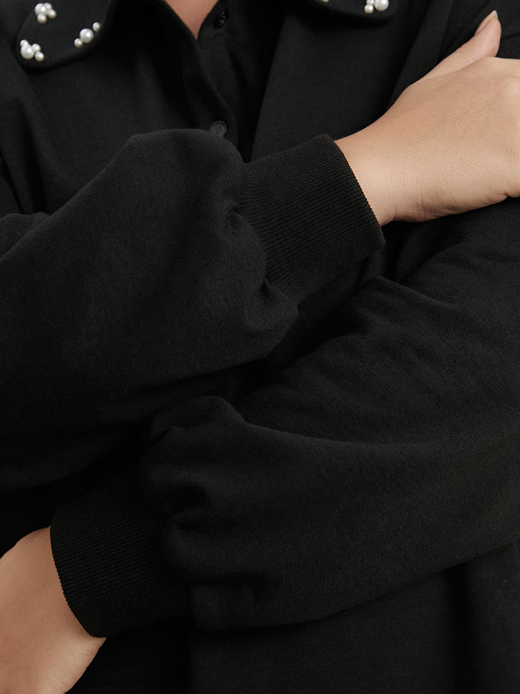 Solid Button Up Pearl Beaded Polo Neck Sweatshirt
